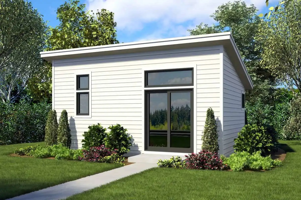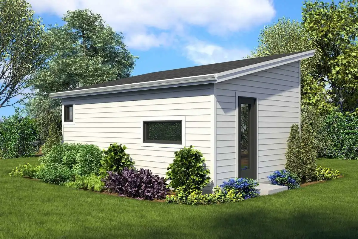 For an affordable and stylish plan, look no further than this farmhouse building. Useful as a full-time tiny home or a weekend getaway, versatile for any lot, this plan is 322 square feet of practical space. The front entry is joined by a sliding glass door on the opposite side of the home, creating two points of access indoors. Inside you’ll find a full bathroom and a multi-functional vaulted living room that can serve as a dining room, living room and bedroom, all in one! To top it all off, this plan offers the option for a kitchen if you decide that you really want to make this space feel like home and have maximum functionality.