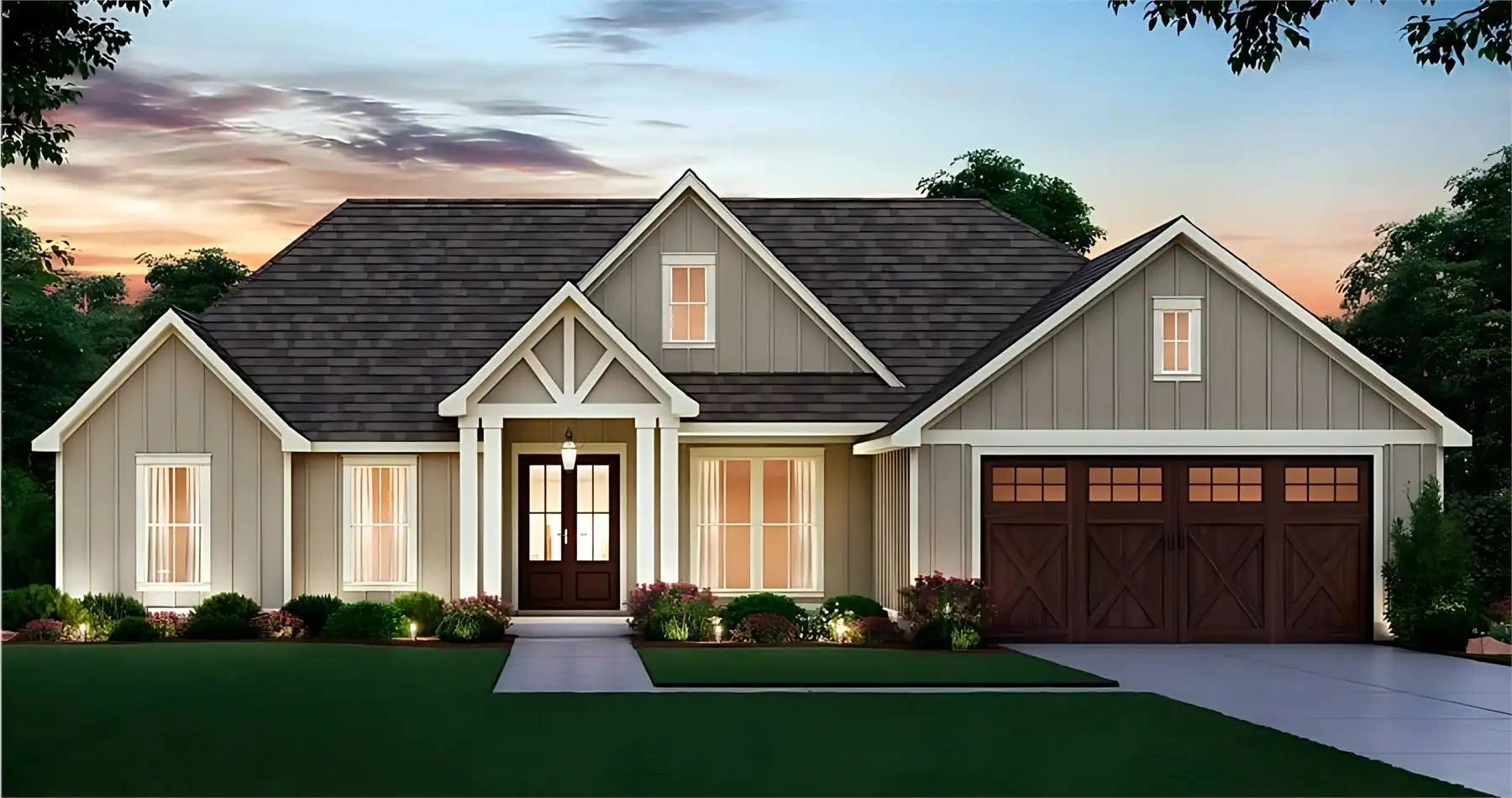 An affordable home with added style, this traditional Craftsman ranch is a great family home. 4 large bedrooms and 2 bathrooms join with 1,889 square feet of living space to provide you all-around comfort and convenience. This is especially seen in the common areas like the spacious family room and nearby eat-in island kitchen. But you'll also notice unparalleled convenience in places such as the 2-car garage and the master suite with its dual-vanity bath and walk-in closet. And don't forget to check out that backyard entertainment area, complete with its own outdoor kitchen, sure to be the highlight of neighborhood barbecues and block parties.
