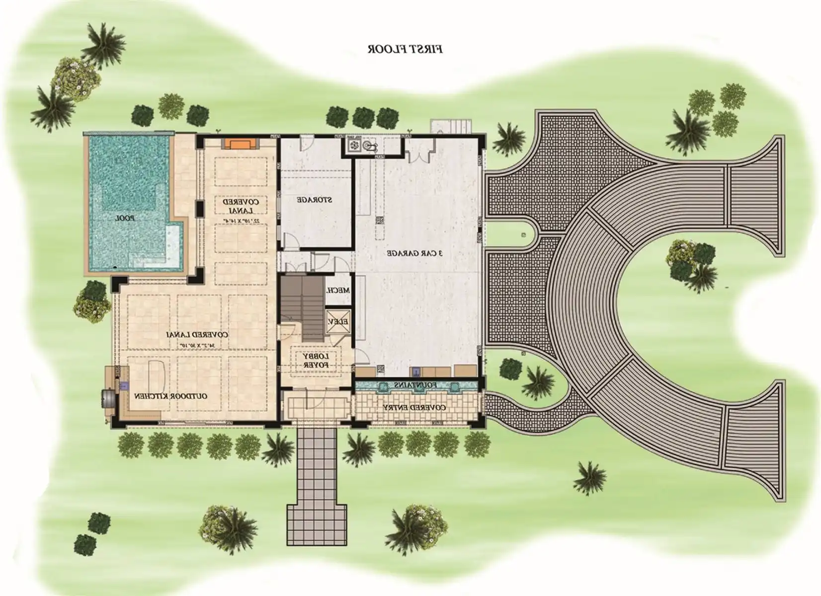 Plenty of windows enhance this contemporary-style house plan, which boasts four bedrooms, 4.5 baths and a luxury 5,680 square feet of living area. Visitors may ascend to the third floor of this home plan via elevator, then converse with you in the living/dining room. The island kitchen showcases two pantries and a refreshing bar. Enjoy meals in the dining area or the breakfast nook, or even on a balcony. You'll love the sensible office, with a place to put your files. Down one level, double doors introduce the spacious master bedroom with covered balcony. You'll appreciate the large walk-in closet with a unique secure section. The personal bath incorporates a sizable tub, plus two showers and two sinks. Children or visitors will love the privacy afforded by three secondary bedroom suites. A media room and a workroom round out this level of the home design. On the first floor, builders point out that you'll be able to host a neighborhood party with the outdoor kitchen, covered lanai and optional pool.