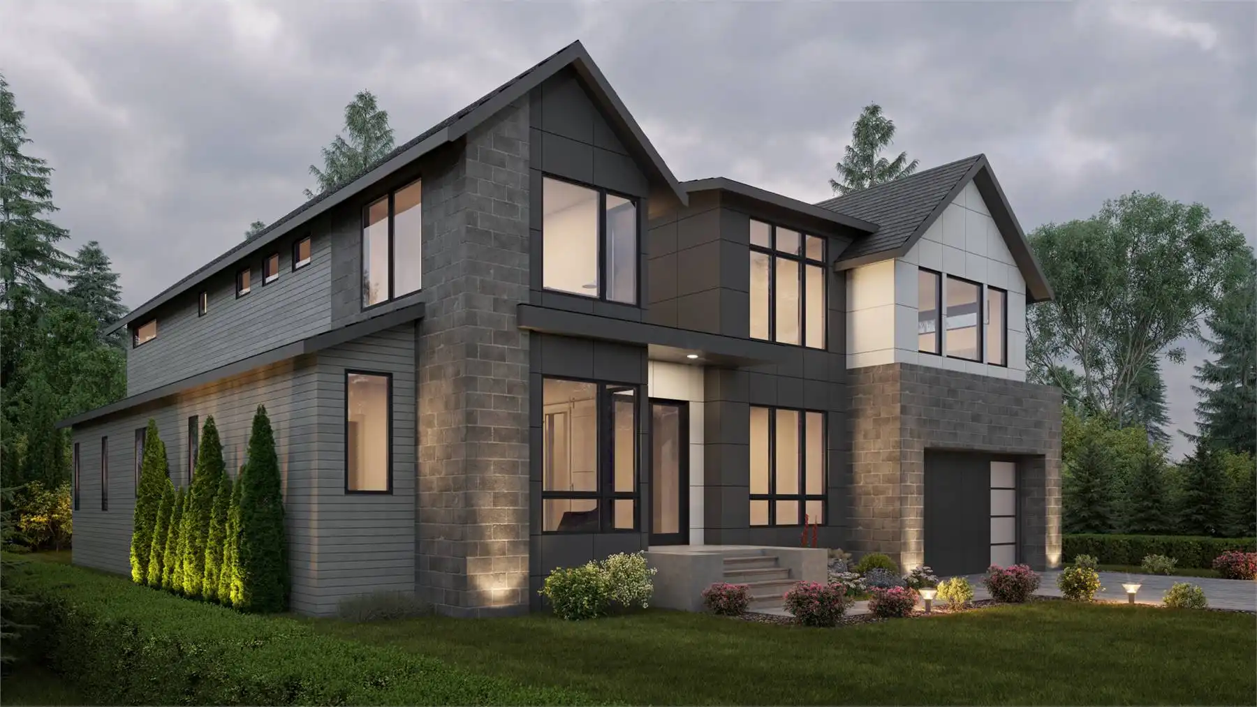 Explore the allure of this captivating contemporary two-story residence, meticulously designed to spark your imagination. Upon entering the foyer, a discreet closet conveniently stores coats and shoes, while to your right, a den creates an ideal home office space. To the left, an open dining room space beckons, providing a second exit leading to the kitchen. The heart of the home unfolds into a grand great room, an ideal venue for hosting, adorned with a stunning fireplace and an open connection to the second story above. This expansive area seamlessly links to a nook for casual family meals and a spacious U-shaped kitchen, featuring a walk-in pantry and an island with an eating bar. On the right side of the main floor, discover a guest suite with a private ensuite for added convenience. Ascend the stairs to the upper level, where three bedrooms share two full bathrooms, accompanied by a bonus room and the owner suite with a luxurious ensuite showcasing a double vanity sink and a soaking tub, complemented by a massive walk-in closet. Returning to the first floor, a covered rear patio and a three-car garage contribute the final touches to this exceptional modern home tour.