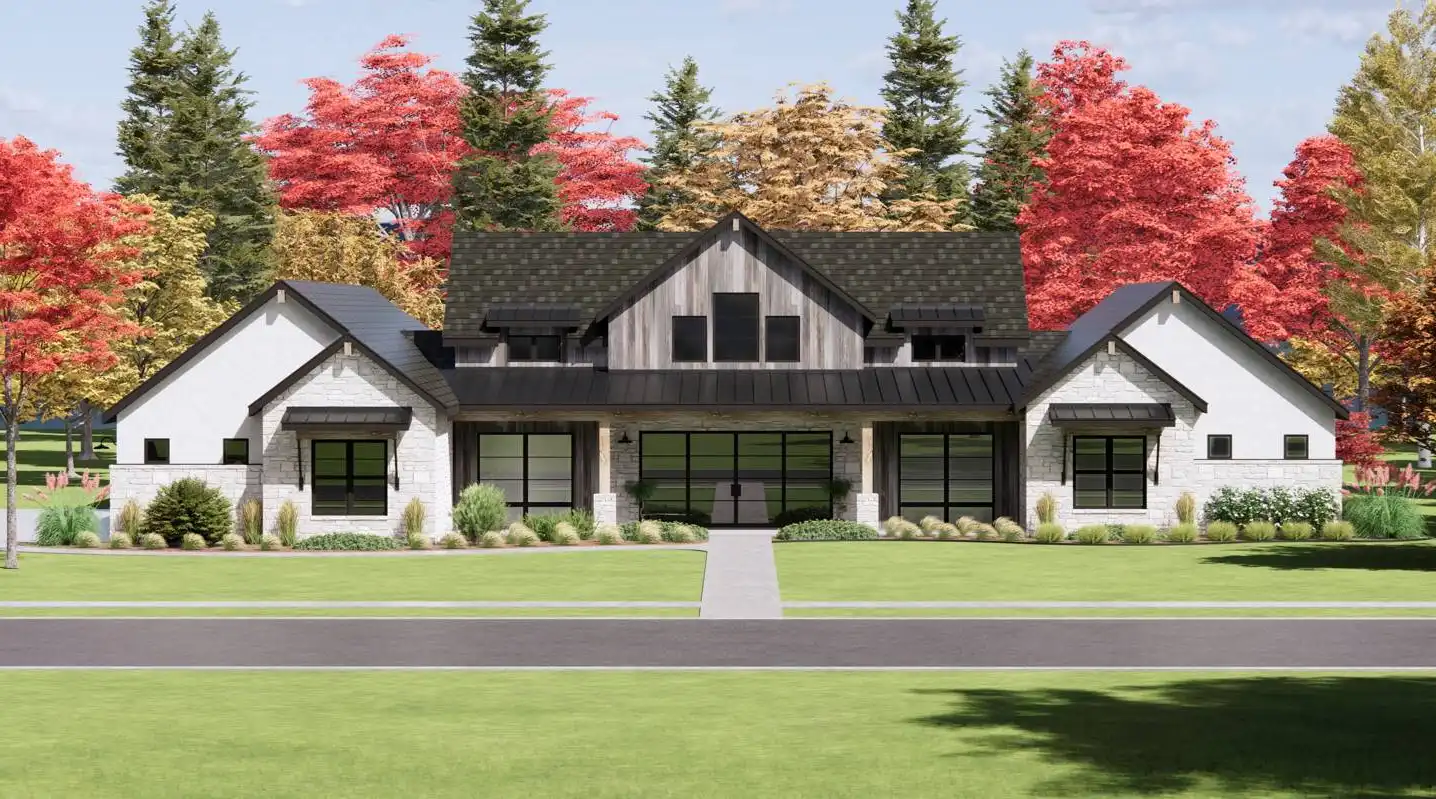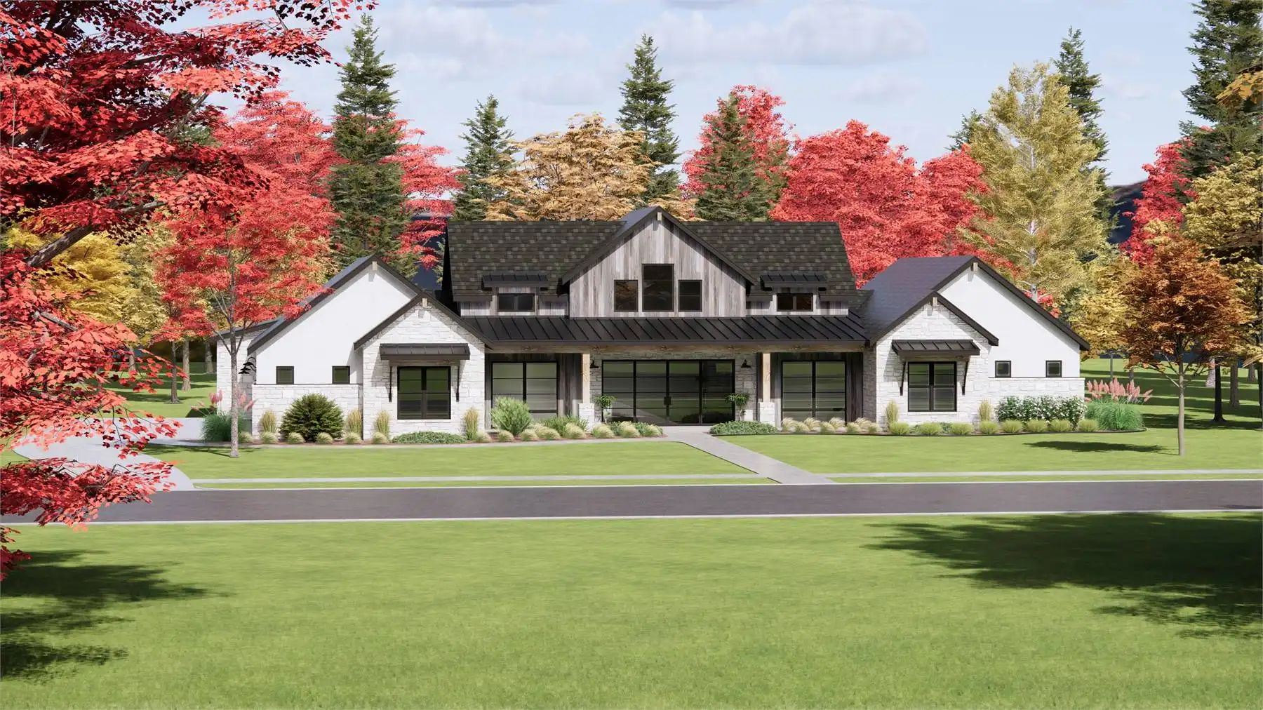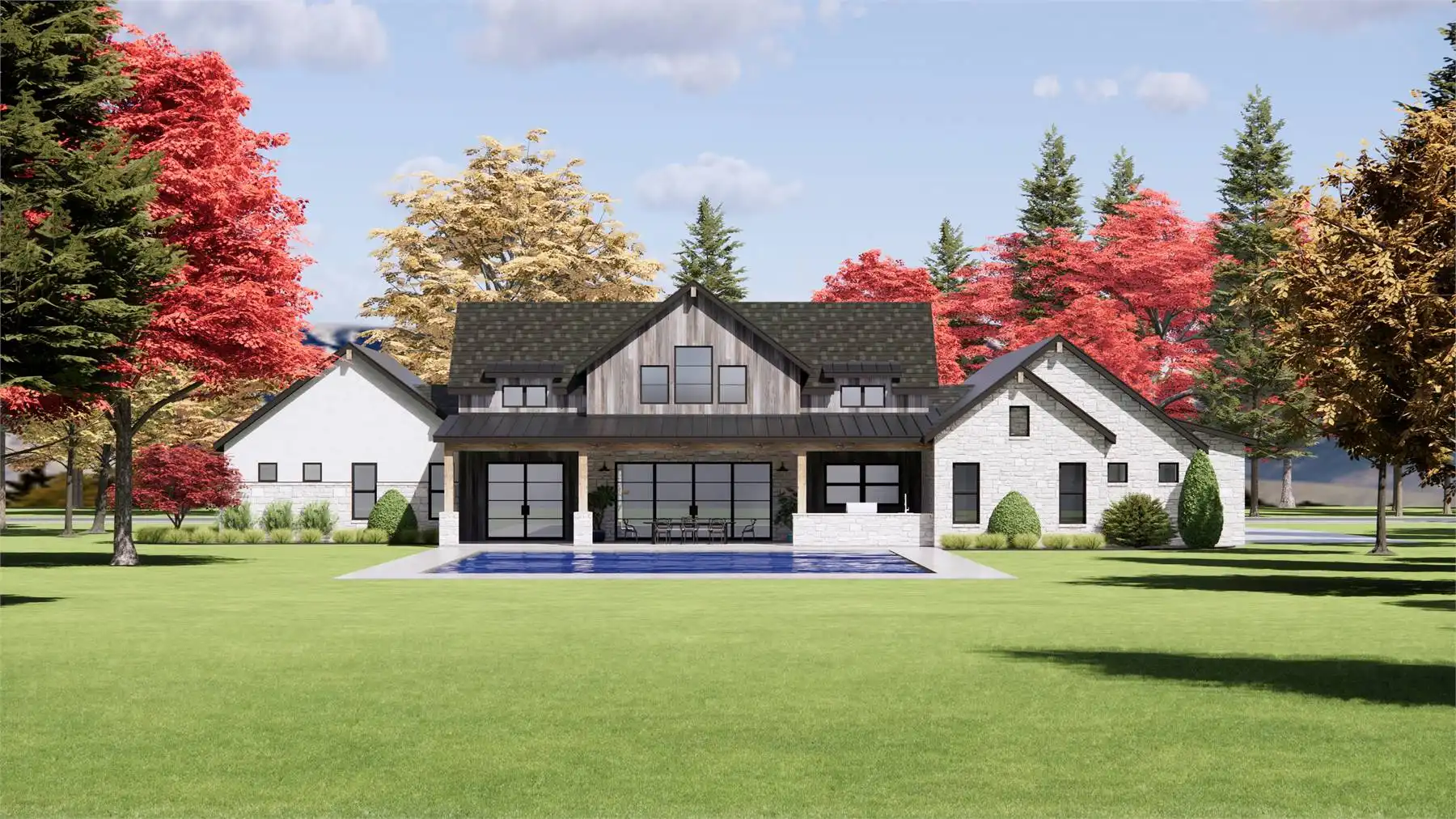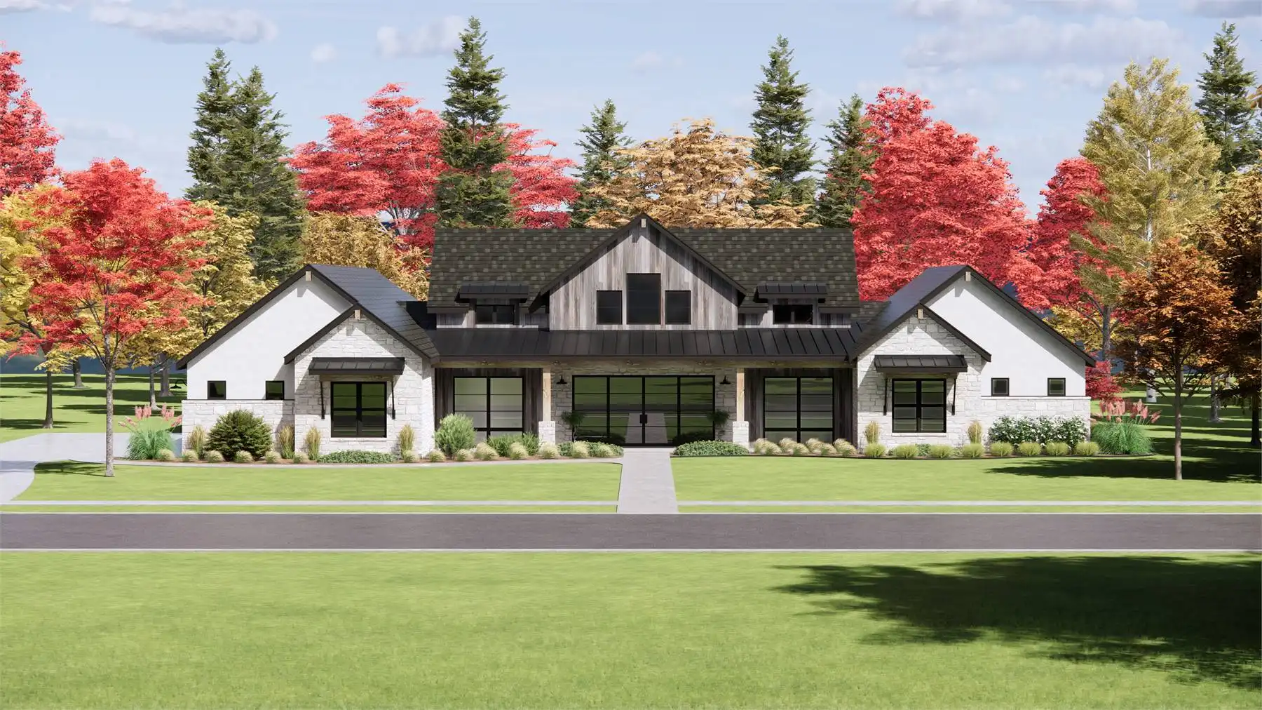 Check out House Plan 7297 if you're looking for an outstanding ranch with plenty of room to spread out! This modern farmhouse-style design has 3,652 square feet on one level and includes open-concept living beneath vaulted ceilings, formal dining, an office, a game room, and four split bedroom suites. The primary suite is one to behold with its vaulted bedroom and five-piece bath. The other bedrooms have three-piece baths. But that's not all--there's also an outdoor kitchen on the back porch that expands the livability of this home even more!