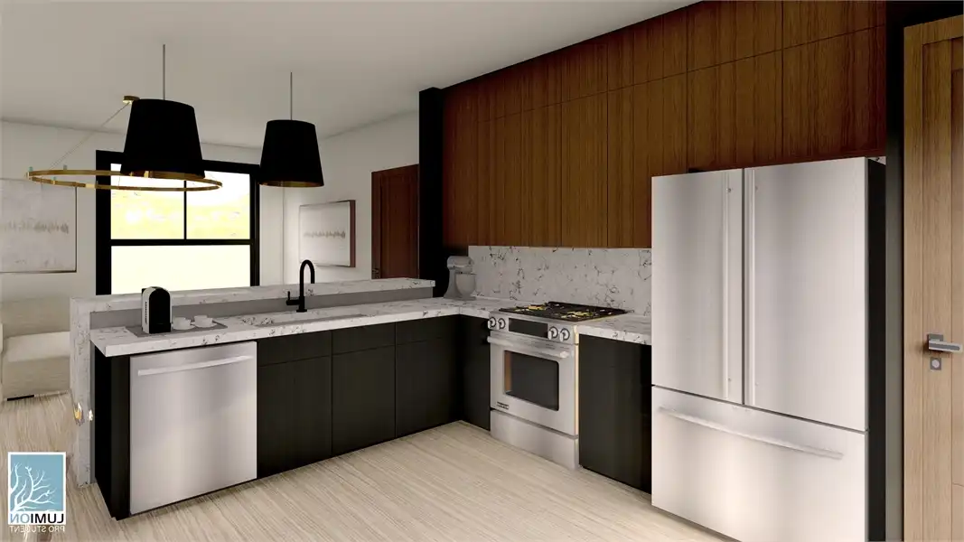 The Greenview. We took the ever-popular Greenview plan and incorporated customer feedback to create the fresh additions of The Elmwood! As with many homes, it begins with curb appeal. A steep roofline pairs perfectly with the contemporary aesthetics that surround the home, while a mix of stonework and vertical paneling creates a rustic natural character about the home. A carport on the side offers shelter for up to two vehicles, but the deck above it is what will catch your eye first. 270 degrees of stunning views surround this gorgeous deck. Imagine enjoying an early morning coffee listening to the birds, or watching a sunset, all from your amazing second story deck. All of this and more is possible with The Elmwood and its beautiful designs that make the most of its surroundings. Upon entering, you are greeted with a spacious, open floorplan. Walking from the entryway through the living space to the beautiful kitchen, you’ll notice something—The Elmwood is completely and totally open concept! Bar seating on the peninsula is great for casual meals, and a more formal table space can accommodate a table for a more sit-down experience. Patio doors flow on to the patio in back, which will make outdoor events a breeze. For the host or hostess at heart, a half bathroom on the first floor is great for guests and is an update from The Greenview’s original plans. A main level master suite is also offered in The Elmwood, and it boasts a reorganized layout for better privacy and natural lighting. A double vanity, a walk-in shower, a toilet nestled away, and a roomy walk-in closet, gives this home plenty to appreciate! Moving upstairs, you’ll find two additional bedrooms and a full, shared bathroom. A second floor laundry room makes it easier for the kids to do chores, but they’ll enjoy their private own loft, as well! By making it another living space, or a more specialized game or media room, nobody in the family will feel constrained by the reduced square footage of the floorplan. The loft also opens to the deck on top of the carport, creating plenty of opportunity for everybody to get fresh air.. If you’re curious about the finishing touches of The Elmwood, check out the trusted Architect Preferred products in the floor plan and listing below. And if you really like this design but wish it had a garage, check out