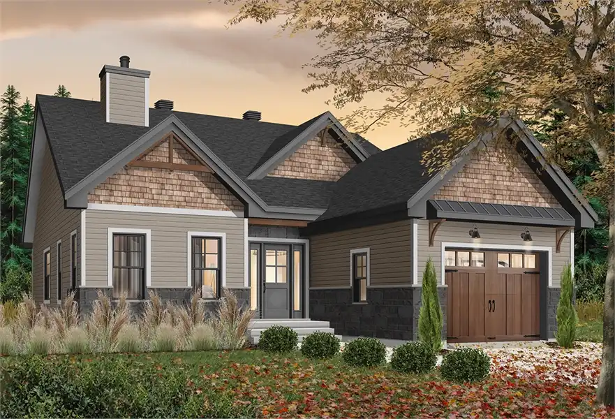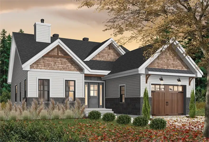 This affordable 1,441 square foot Craftsman house plan features 2 bedrooms and a one car garage, making it a great starter or vacation home. The open floor plan is highlighted by a two-sided fireplace shared by the living and dining room. The galley kitchen overlooks the rear deck and has a kitchen island with seating for four, wine cellar and walk-in pantry. The master suite has a private bath with walk-in closet and is separated by a second bath and bedroom, with a nearby laundry room. For expanded living space, this home offers a full basement.