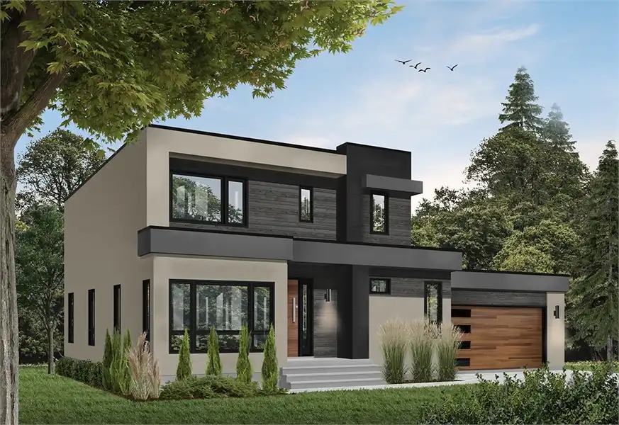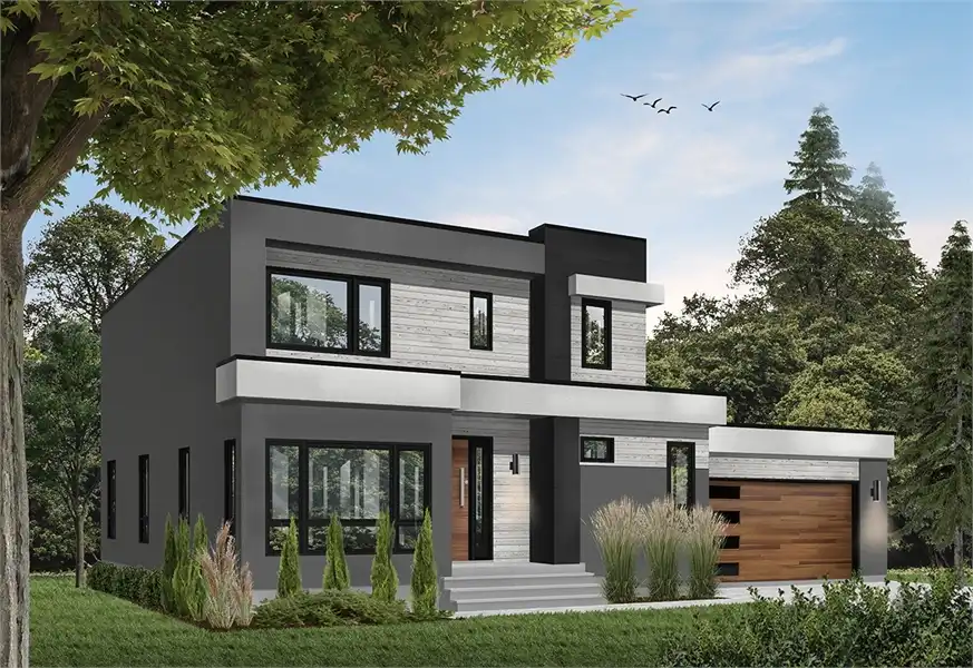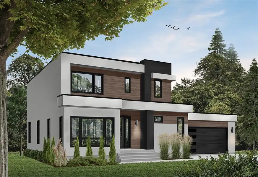 This modern style home plan with a double car garage, has 9 'ceiling's throughout the main floor. The closed foyer has a coat closet conveniently located as you walk in. The home office can be a 4th bedroom, or playroom for younger children. Inside the master suite is a private balcony, good size walk-in closet, and master bathroom with a large shower. The kitchen with lots of counter space, island, and a pantry, is a great place to gather around for a cup of coffee. You can cozy up in the living room next to the fireplace on those chilly nights. The folding patio doors in the dining and family room area, lead to a covered terrace at the rear where you can enjoy a beautiful view of the garden. A Half bathroom and laundry room is centrally located off of the kitchen for your guest. The 2 additional bedrooms are located on the second floor and share a large bathroom with shower, bathtub, double vanity and toilet. The spacious double garage has access to the basement, rear and side of the house, and the main floor of the house. The Unfinished basement can be easily finished for additional bedrooms, storage, home theater, etc.