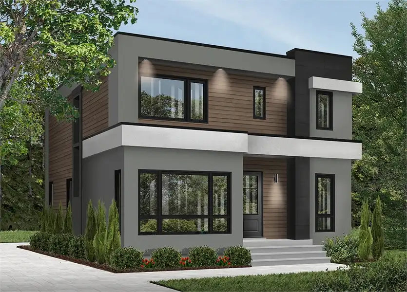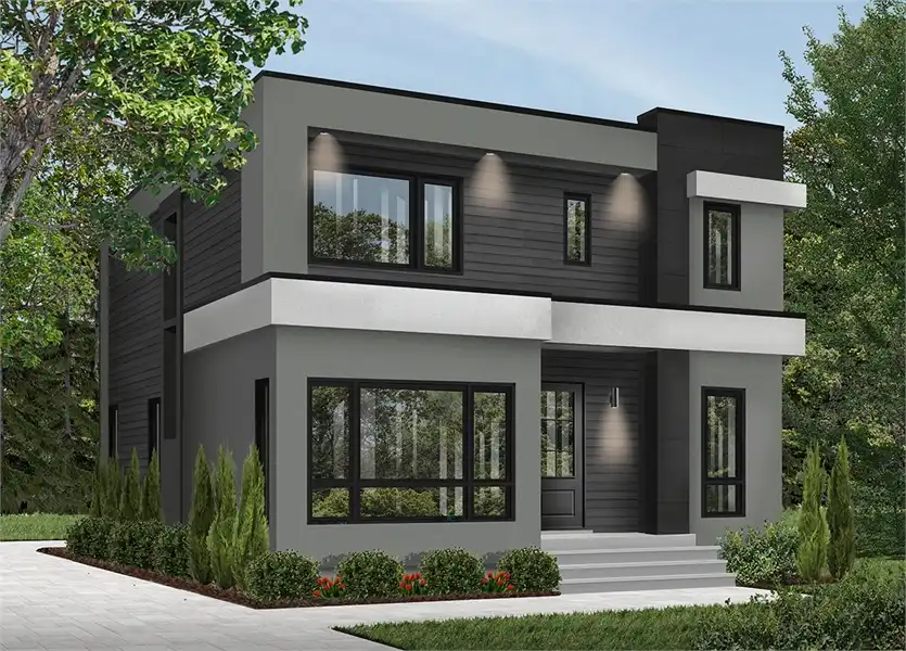 This contemporary cubic house plan has a lot of natural light, and 9 'ceiling's throughout the main floor. When walking in to this beautiful design, there is a closed foyer with a coat closet. On the main level you will find a conveniently located home office or 4th bedroom. The spacious master suite has a private balcony, good size walk-in closet, and private bath. Inside the well designed kitchen is plenty of counter space, a kitchen island and a good size pantry. The living room is a great place to wind down and relax with the warmth of the fireplace. Folding patio doors in the dining and family room area open up leading you to a covered terrace at the rear of the house. A half bathroom and laundry room is centrally located off the kitchen. Two secondary bedrooms share a very large bathroom with separate shower and bathtub. The unfinished basement can be easily finished for additional bedrooms, storage, home theater, etc.This contemporary cubic house plan has a lot of natural light, and 9 'ceiling's throughout the main floor. When walking in to this beautiful design, there is a closed foyer with a coat closet. On the main level you will find a conveniently located home office or 4th bedroom. The spacious master suite has a private balcony, good size walk-in closet, and private bath. Inside the well designed kitchen is plenty of counter space, a kitchen island and a good size pantry. The living room is a great place to wind down and relax with the warmth of the fireplace. Folding patio doors in the dining and family room area open up leading you to a covered terrace at the rear of the house. A half bathroom and laundry room is centrally located off the kitchen. Two secondary bedrooms share a very large bathroom with separate shower and bathtub. The unfinished basement can be easily finished for additional bedrooms, storage, home theater, etc.