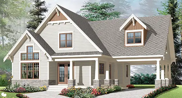 This beautiful 1,348 square foot country cottage house plan features 2-bedroom, 2 bath. With cathedral ceilings in the living room, it brings symmetry to the home. The spacious kitchen allows room for a large table and chair set. The master bedroom is located on the first floor, with a separate bathroom that has a garden tub and stand up shower. The mezzanine allows you to view the living room area below. On the second floor you will find the second bedroom that has a great window view, and a bonus space that can be used as a family room or third bedroom. The large carport has alluring stonework and a side entrance into the house. With the front porch and pitched roof this house would look excellent near a mountain or lake.