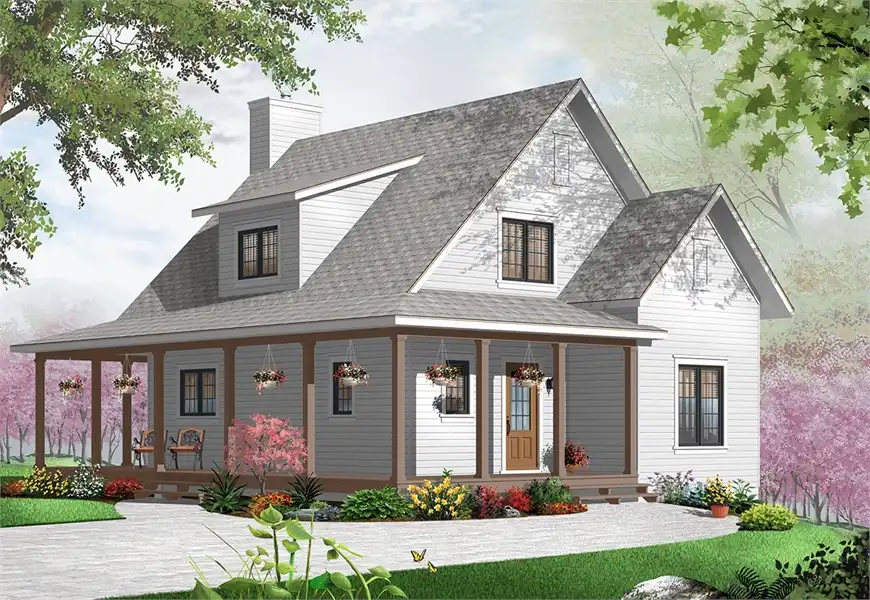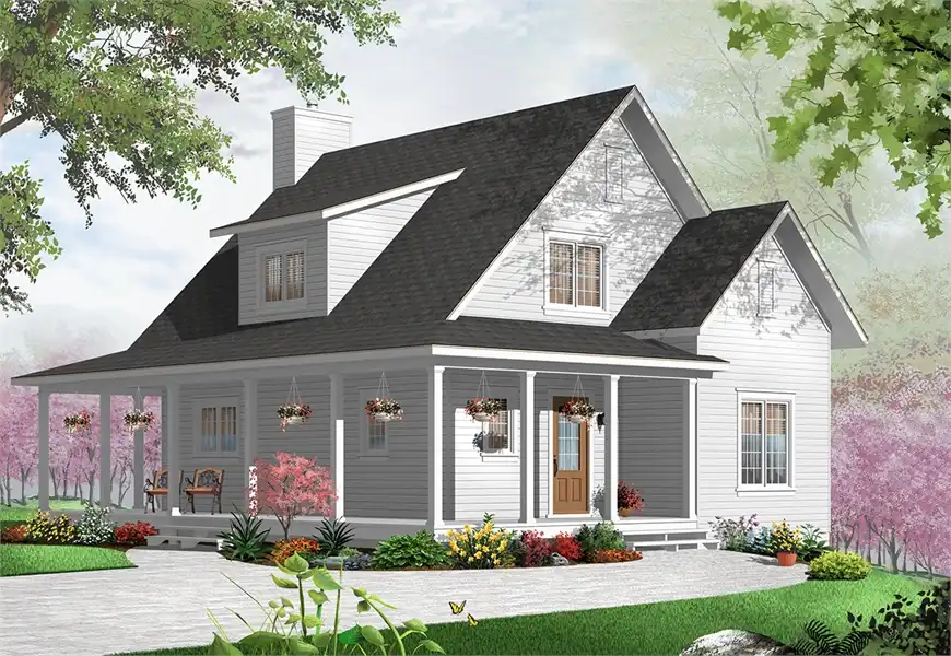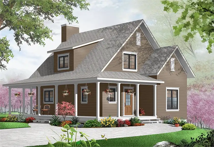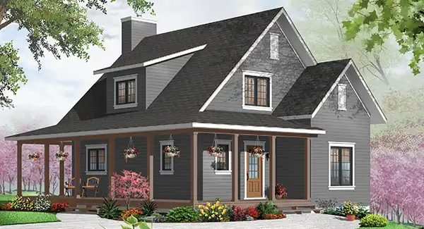 This enchanting cottage house with 3-bedroom, 2 bath, 1,370 square feet would be perfect in the country or the city. An inviting porch wraps around three sides of this charming country cottage for a perfect promenade and sheltered access to the front entrance and back door as well. Inside, live gracefully on the main level with full amenities. The open activities area is oriented toward the back of the house to capitalize on privacy and backyard views. Features include a central fireplace, abundant windows and a vaulted ceiling in the living room. The master bedroom enjoys easy access to a generous bathroom with large tub, discreet toilet room and convenient laundry. Upstairs children and guests will appreciate a private sleeping level with two bedrooms and a 4-piece bathroom. A beloved model that oozes country charm.