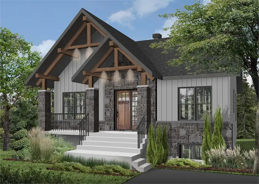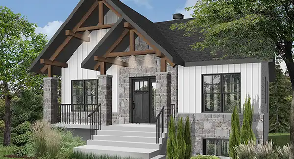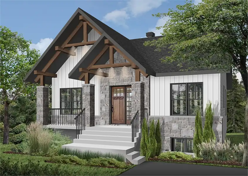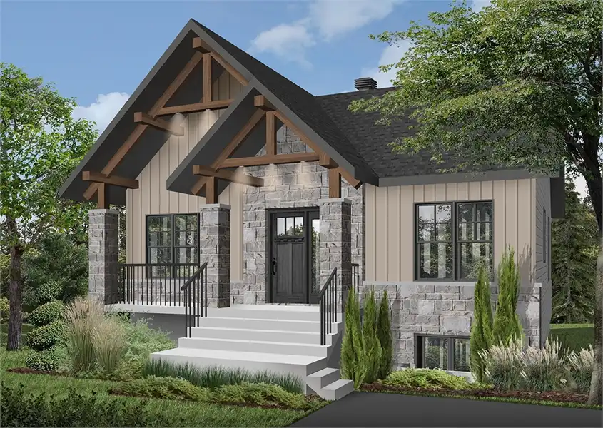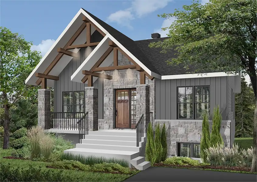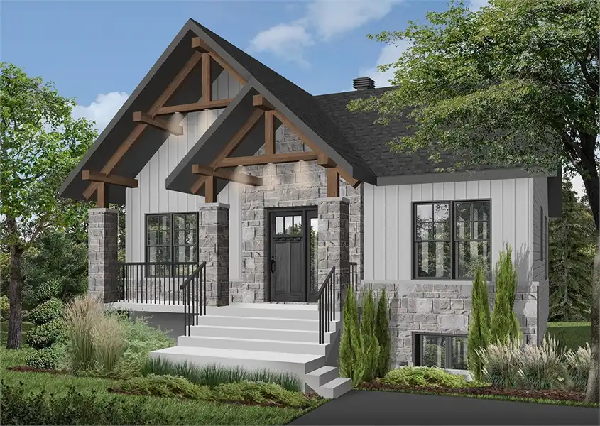 This 1,020 square foot Craftsman house plan features 2 bedrooms, and 1 bath. The front entrance takes you directly into the kitchen, which is open to the dining and living room. The open floor plan layout are appreciated in smaller home models. The master bedroom has access to the bathroom through the hallway. The 2nd bedroom can be used as an office or den. There is abundant fenestration, a barn door entrance, wooden gables, and board and batten siding with stone and wood. With this beautiful design and appealing landscape this model is great for a first time home buyer or young customer.