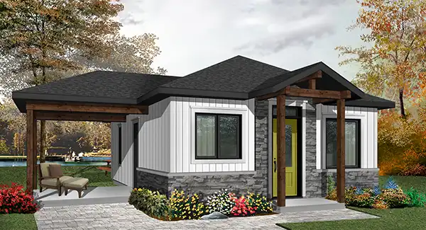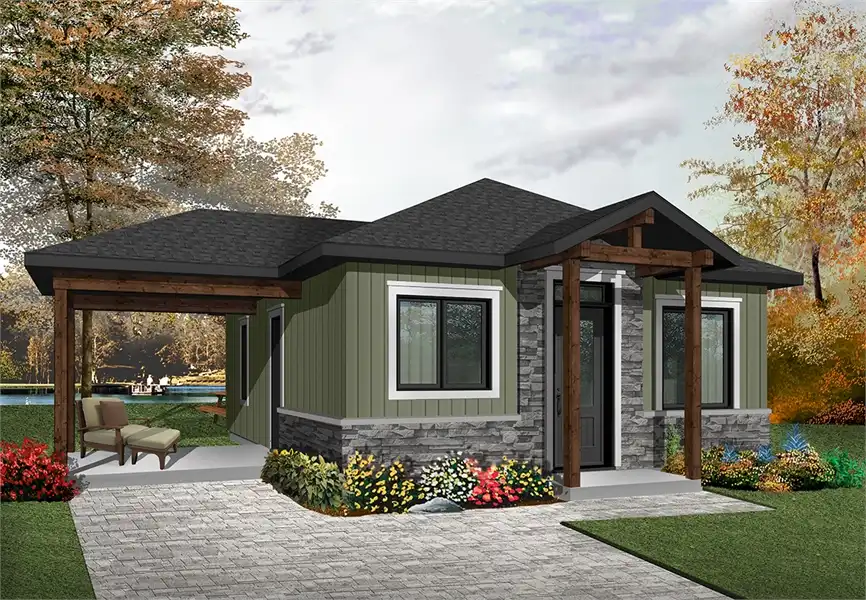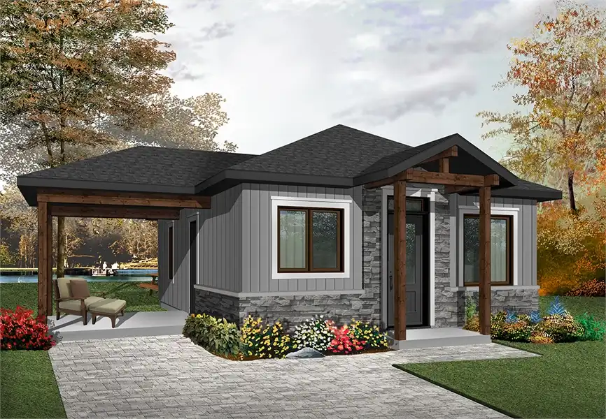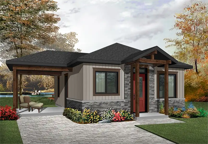 This modern rustic house plan boasts of a rustic exterior with plentiful stonework, and timbered beams. Perfect for a mountain top property lot, with ideal space to unwind and relax from everyday life. There are approximately 643 square feet of living space that incorporates two bedrooms and one bath in the single story home. Directly accessible from the laundry room is a large covered outdoor living area; this space is highlighted with a rustic environment in which to entertain, or rest. The home is designed for small and/ or narrow lots. The interior floor plan features a small-scale living room with a fully functional and cozy kitchen. There are two bedrooms on the backside of the home; with wonderful window views. This rustic home features the ultimate in vacation living for a young family, empty nester's or professionals looking to escape for a long weekend.