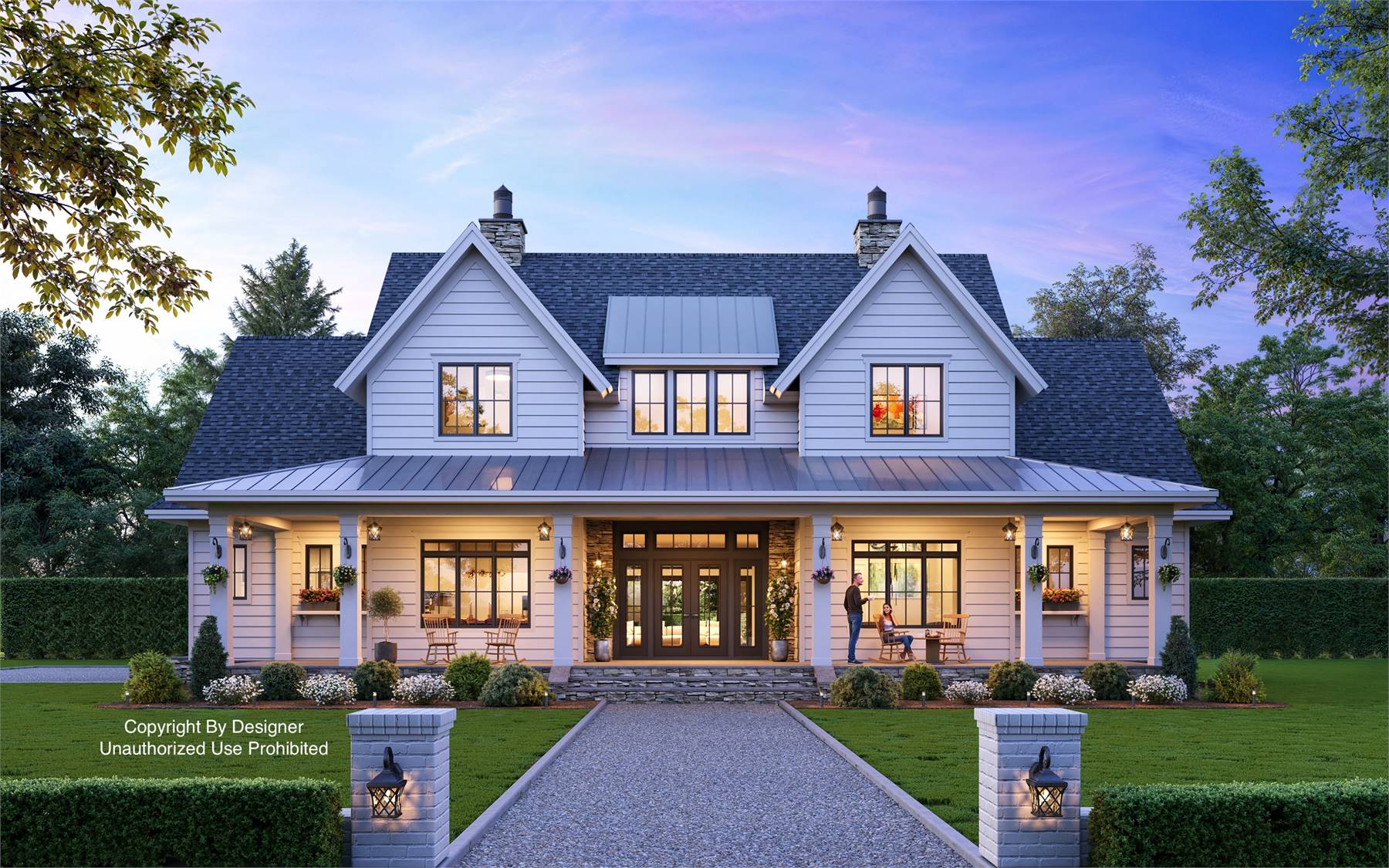 This new four-bedroom, 4.5 bath, 2,743 square foot farmhouse home plan is perfect for a growing family. An open great room with fireplace, dining room and kitchen is perfect for family gatherings and entertaining guests. The spacious kitchen offers plenty of cabinets for storage, an ample sized island with eating bar and large walk-in pantry. Sliding doors in the Great room open up to a 10 x 33 rear porch with access to a small powder room. A gorgeous master suite and bath feature a garden tub, double vanity sinks and a large walk-in-closet. Moms will love the mudroom off the garage and the cozy computer room off the kitchen. Upstairs two bedrooms, a bath with double vanities and two bonuses space areas that could serve as a high-tech home theater, gym, office or an in-law suite.
