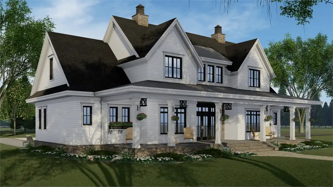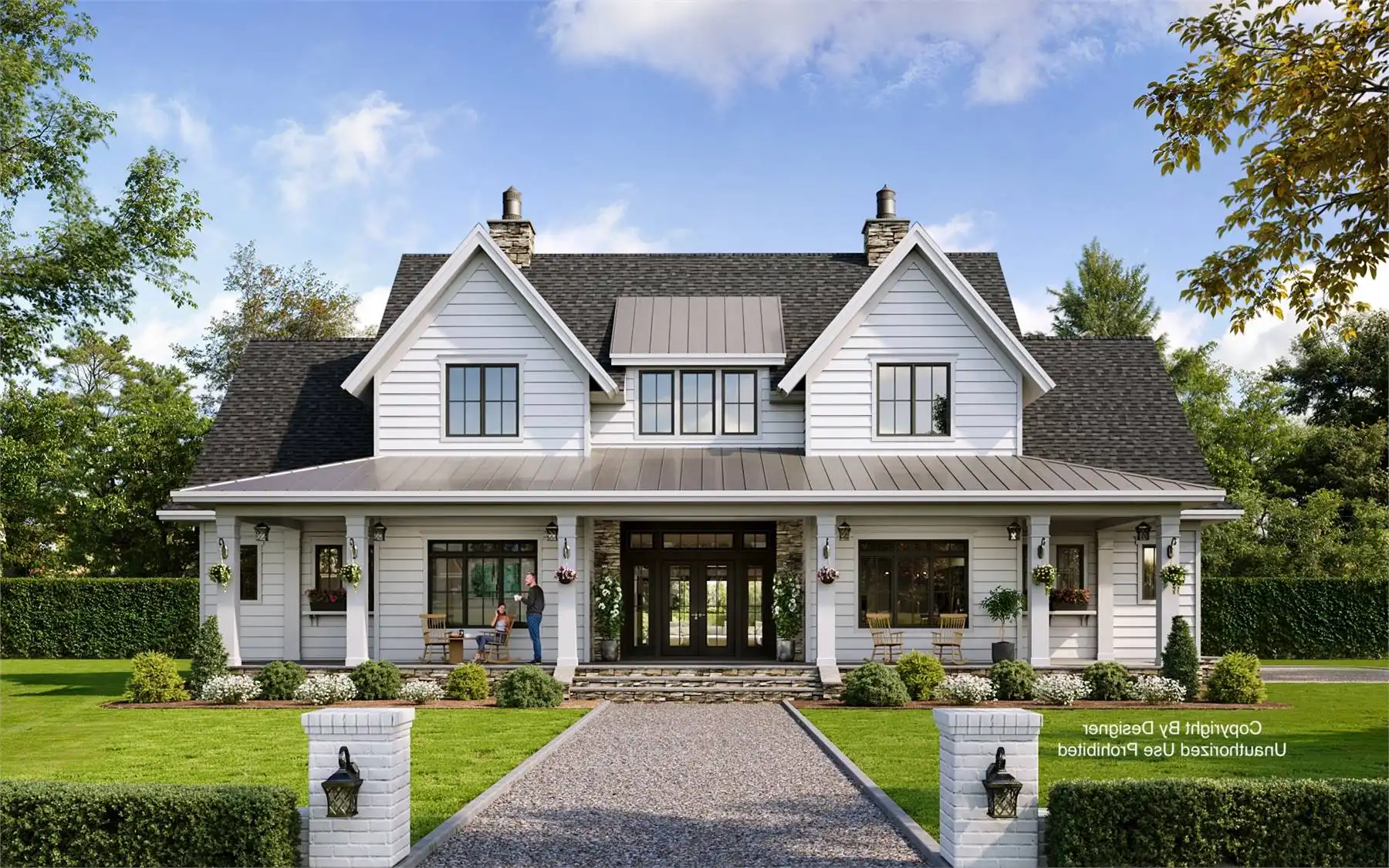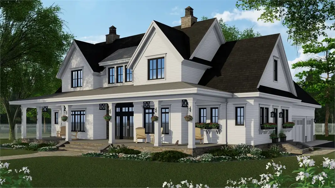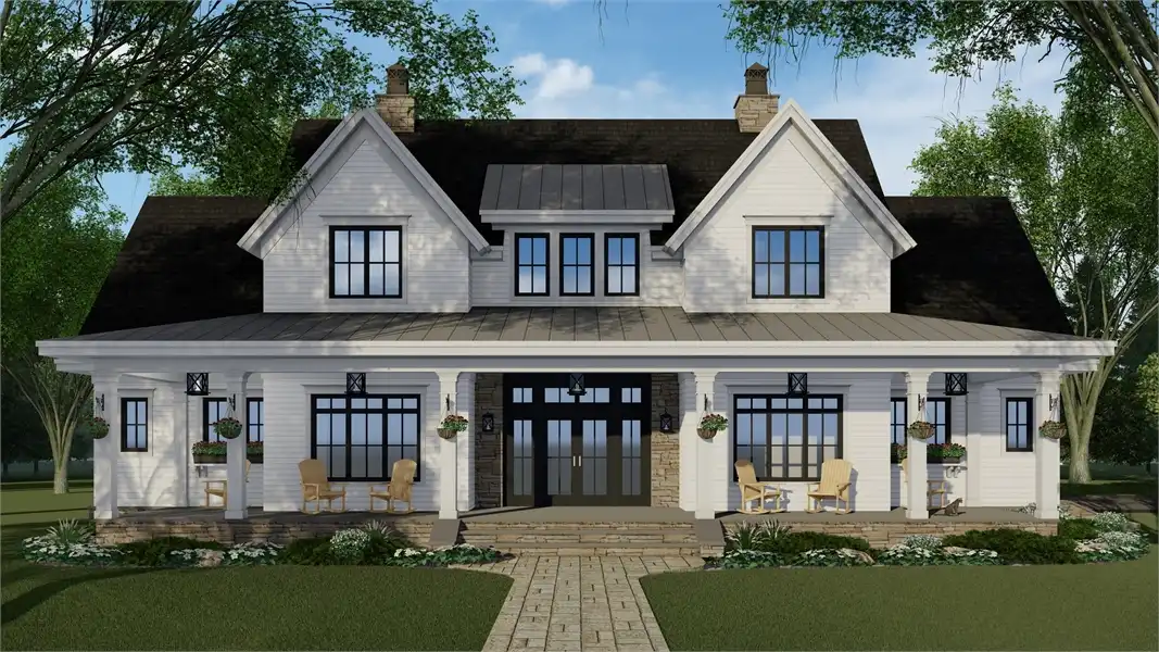 This new four-bedroom, 4.5 bath, 2,743 square foot farmhouse home plan is perfect for a growing family. An open great room with fireplace, dining room and kitchen is perfect for family gatherings and entertaining guests. The spacious kitchen offers plenty of cabinets for storage, an ample sized island with eating bar and large walk-in pantry. Sliding doors in the Great room open up to a 10 x 33 rear porch with access to a small powder room. A gorgeous master suite and bath feature a garden tub, double vanity sinks and a large walk-in-closet. Moms will love the mudroom off the garage and the cozy computer room off the kitchen. Upstairs two bedrooms, a bath with double vanities and two bonuses space areas that could serve as a high-tech home theater, gym, office or an in-law suite.