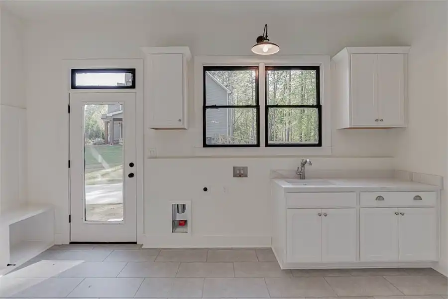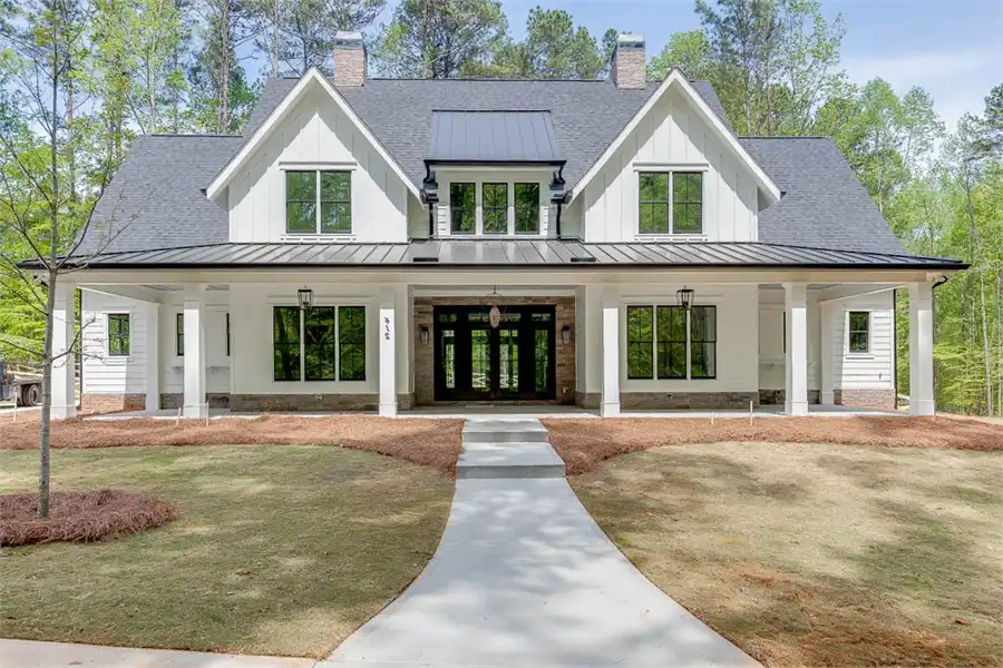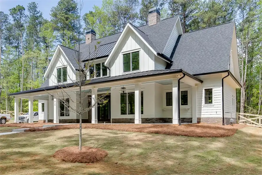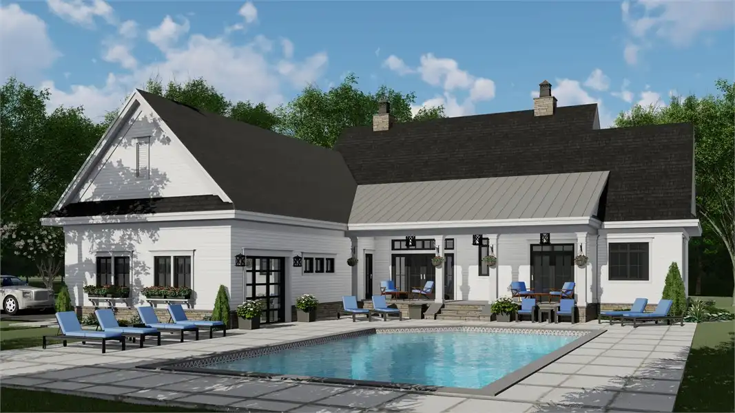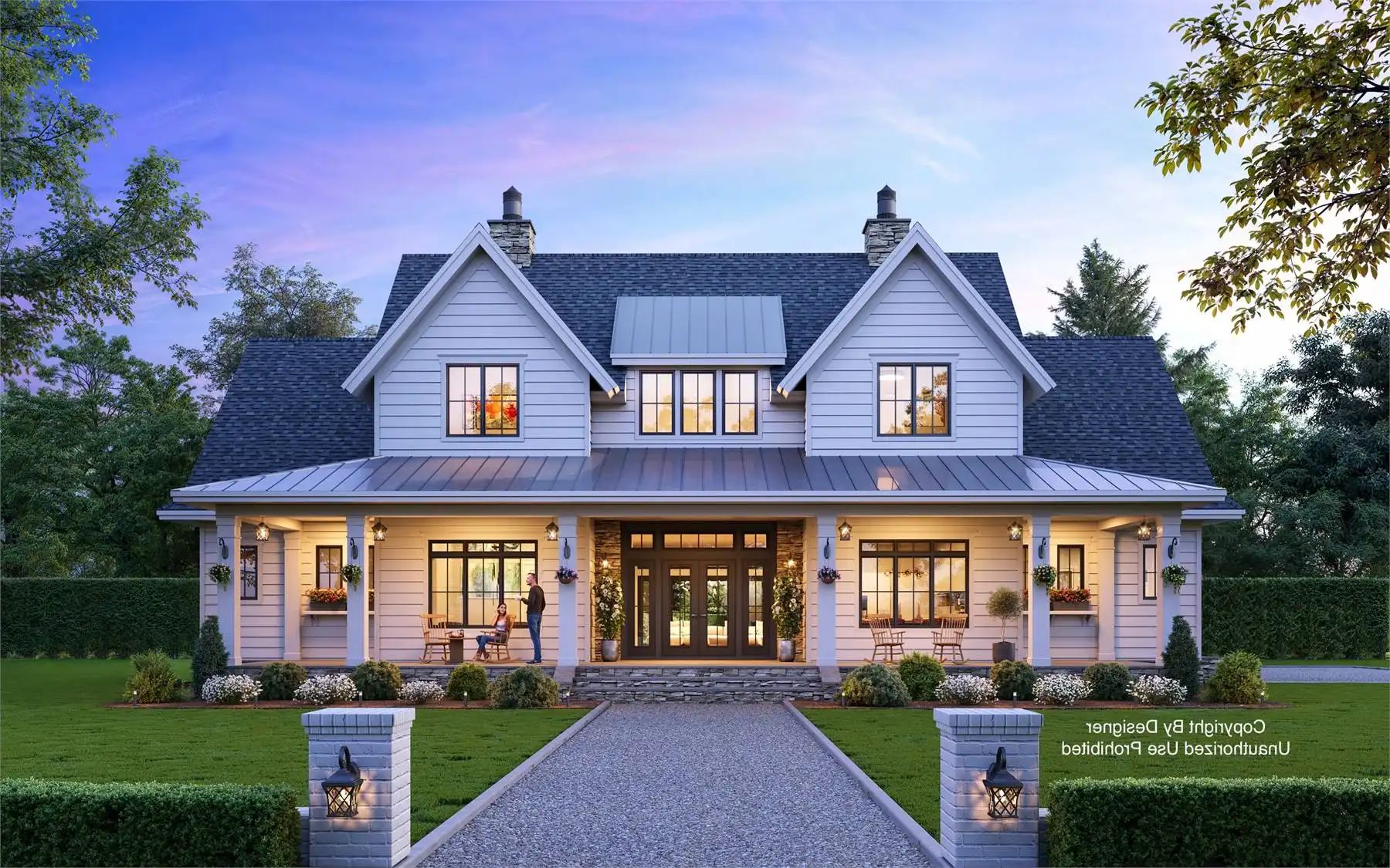 This new four-bedroom, 4.5 bath, 2,743 square foot farmhouse home plan is perfect for a growing family. An open great room with fireplace, dining room and kitchen is perfect for family gatherings and entertaining guests. The spacious kitchen offers plenty of cabinets for storage, an ample sized island with eating bar and large walk-in pantry. Sliding doors in the Great room open up to a 10 x 33 rear porch with access to a small powder room. A gorgeous master suite and bath feature a garden tub, double vanity sinks and a large walk-in-closet. Moms will love the mudroom off the garage and the cozy computer room off the kitchen. Upstairs two bedrooms, a bath with double vanities and two bonuses space areas that could serve as a high-tech home theater, gym, office or an in-law suite.