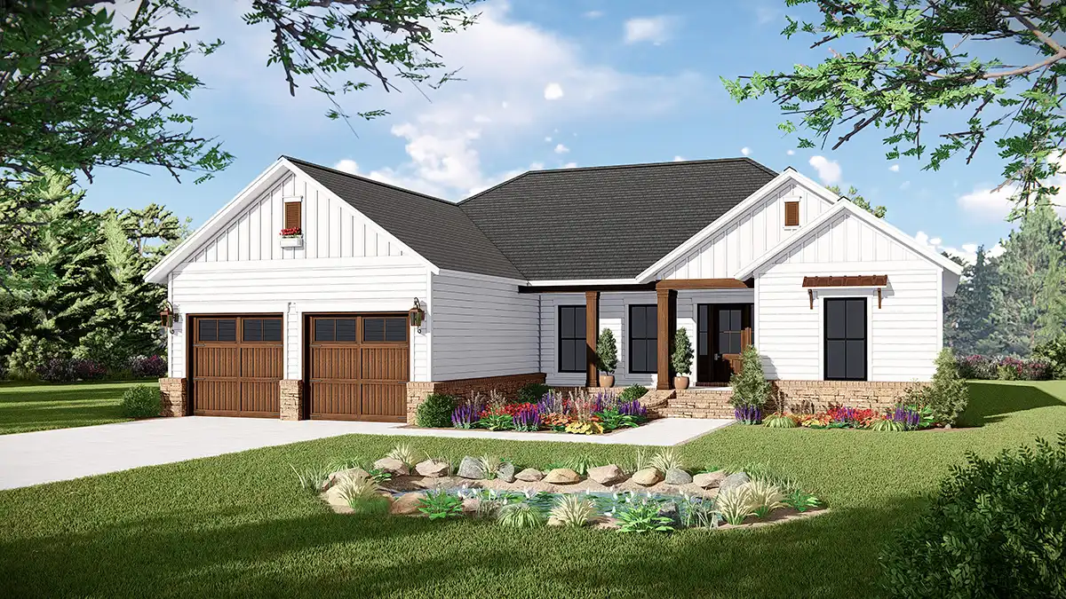 This new affordable charming farmhouse ranch house plan features 1,600 square feet in a functional split bedroom layout with an open center living area. The vaulted kitchen overlooks the deck and has an ample size island with seating. The private master suite enjoys easy access to the laundry room. A two car front entry garage has an optional entry to a basement for added living space.