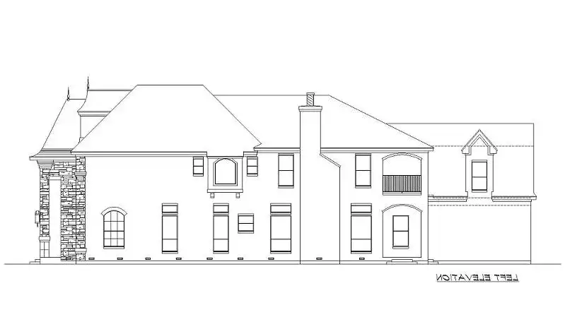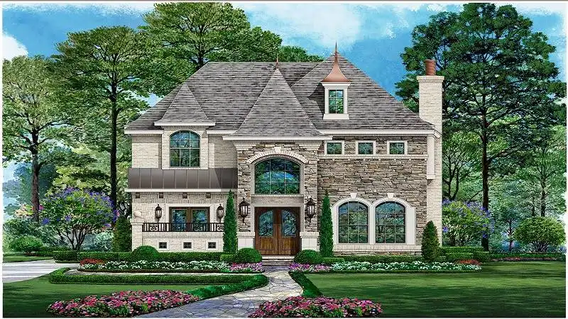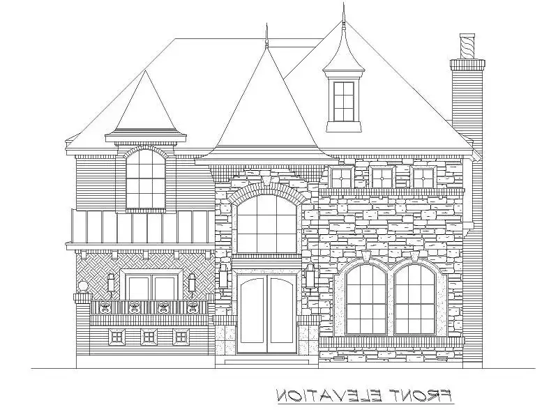 This luxury starter castle is guaranteed to make you a King and Queen. This estate says castle with nothing more then elegance at its finest chimney pots, spires, turrets, balconies, stone, and luxurious elegance. That is what the house plan has to offer. Enter through the double doors under the covered entry to the foyer where a curved staircase greets you and is flanked by a quiet study and elegant dining room. The dining room double French doors access the courtyard to the front and the butlery to the rear of the room. The butlery is off the kitchen, complete with free-standing island, pantry, built-ins, a curved breakfast bar, and modern, state-of-the-art appliances. Serving dinner to guests and family was never so easy and convenient. The breakfast bar separates the breakfast room and family room from the kitchen, offering an open feeling. The family room fireplace warms this area, while the corner bar is a good place to pull up a seat and enjoy visiting the kitchen and family room occupants. The covered patio can be accessed from the family room, while the two-car, rear-entry garage can be accessed through the utility room behind the breakfast room. The utility room has freezer space, and the garage has storage space. A family bedroom sits tucked away between the family room and study with a walk-in closet and full bathroom. Upstairs, two family bedrooms, each with trey ceilings and full baths, share space with a game and bonus room. From the game room, you can access the covered balcony. The master suite is on the left side of the second-floor plan and boasts a trey ceiling, fireplace, and luxurious master bath with his and hers vanities, separate shower and tub, two water closets, and a large wardrobe with built-ins. So many amenities, and perfect for a narrow lot, you will love this luxury starter castle.