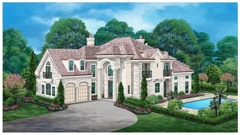 This Mediterranean-style mansion offers luxury in a home fit for a narrow, zero lot line. The stone façade offers Juliet balconies with ornate grilles, arched windows, and a large two-story covered entry with large decorative columns, warm coach lights, and an arched transom. As you enter the foyer of this luxurious home, you immediately have a view of the overwhelming ceiling styles that lead into the family living center, which includes the family room, study/library, dining, kitchen and breakfast room. A curved stairway leads to the second floor plan inside the foyer. Through double French doors, enter the elegant dining room offering a trey ceiling and built-ins. The study/library with a corner fireplace has a second set of stairs that lead to the second floor plan. A doorway from the study/library leads to the two-car garage with work area. Off the gourmet kitchen is a utility room, pantry, free-standing center island, modern, state-of-the art appliances, granite counter top, pendant and recessed light, and an eating bar. The breakfast room has access to an outdoor patio area and leads to the vaulted family room with covered patio. Completing the first floor plan is the master suite with a step trey ceiling and luxurious master bath with his and hers vanities, a separate glass shower, marble step-up tub, and large wardrobe with built-ins. A powder room that sits under the curved staircase in the foyer, completes this level of this European-style luxury house plan. Upstairs, two family bedrooms, each with walk-in closets, trey ceilings and private Juliet balconies, share a Jack-n-Jill bathroom with his and hers vanities. A game and media room share space with a powder room and bonus room with full bath. Awesome views to the first floor plan complete this elegant luxury European-style home plan