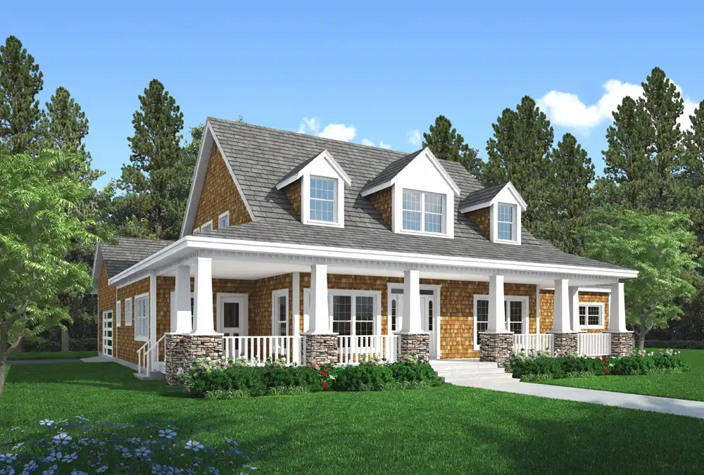 A graceful front porch adorns this country-style house plan, with three bedrooms, three baths and 2,613 square feet of living space. Host friends and relatives in the two-story great room of this home plan, warmed by a fireplace. The formal living room could serve as a library. You'll love the gourmet kitchen, with its sizable island and menu desk. Serve meals in the cozy dinette or the formal dining room. Unwind in the posh master suite, with its bayed sitting area and sizable walk-in closet. In the personal bath, you'll find a sun-drenched spa tub along with a separate shower and dual sinks. A balcony on the second level of this home design overlooks the great room below. Two bedrooms with desks share a split bath. Builders point out the outdoor terrace area, which expands the great room's entertaining space.