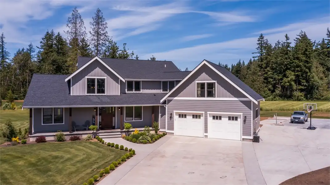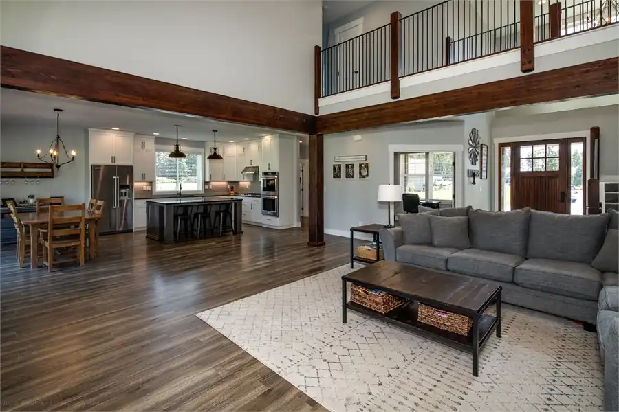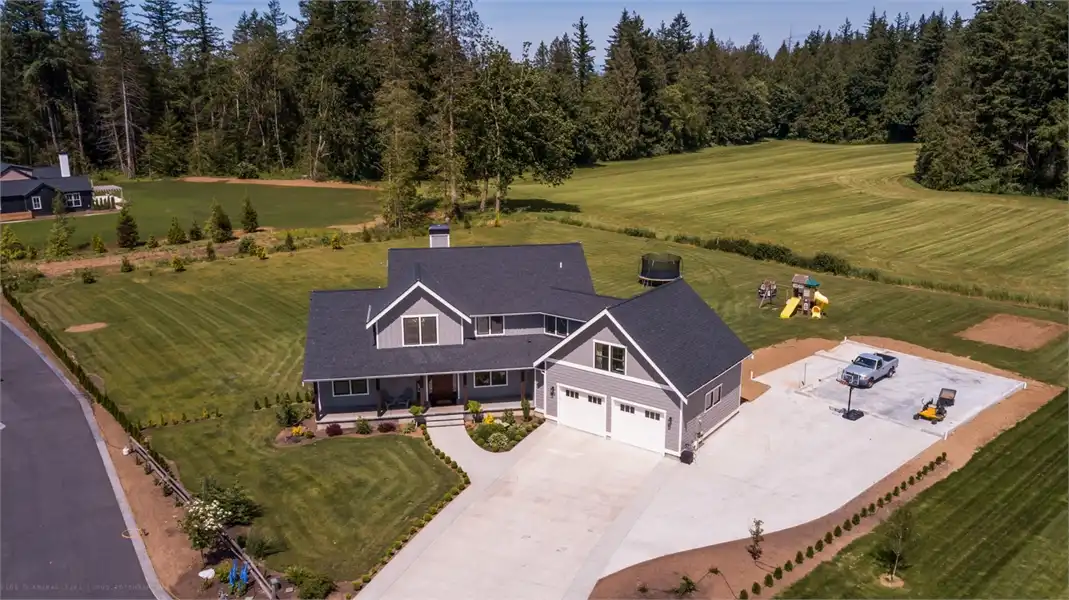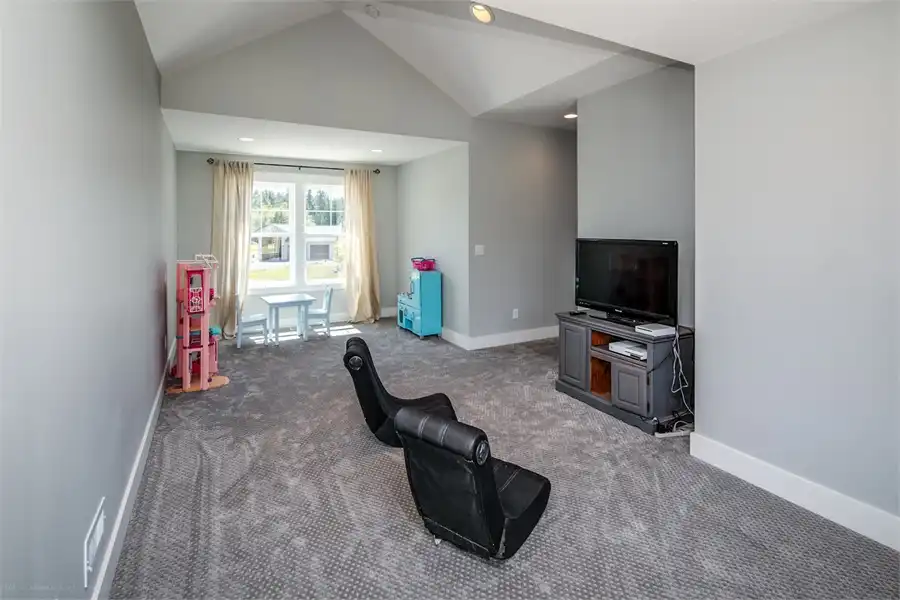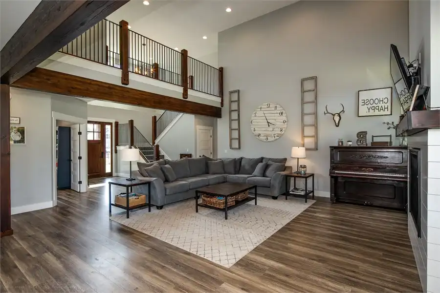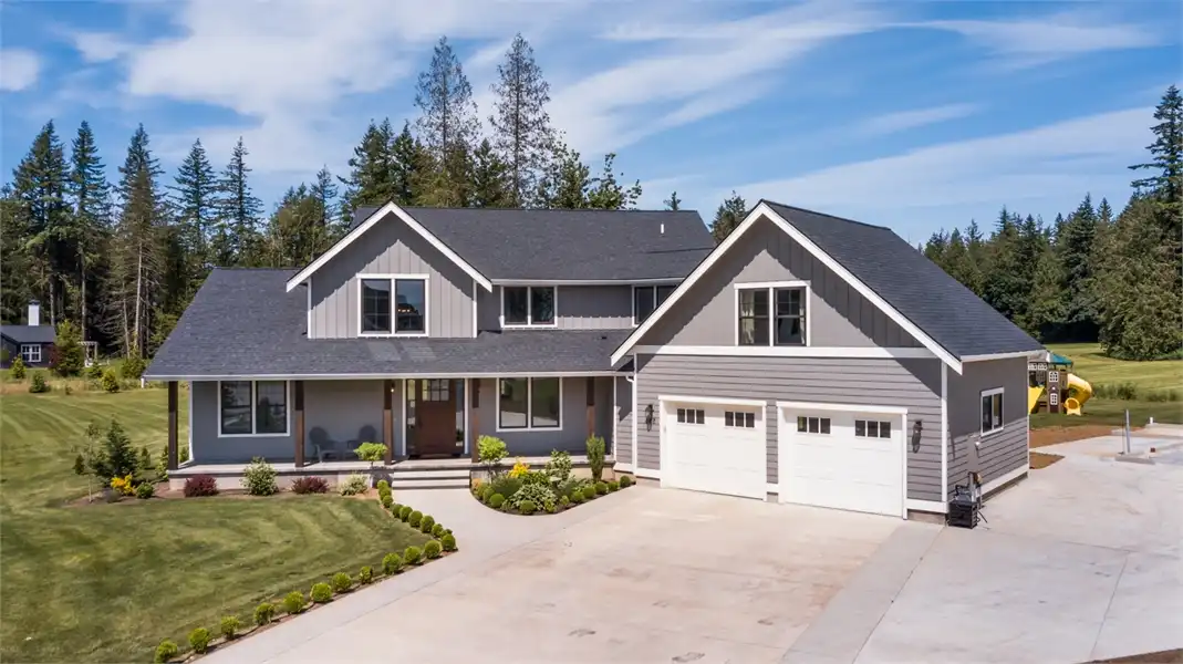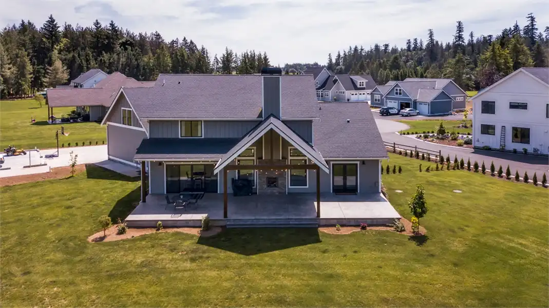 This charming two-story, 4 bedroom farmhouse boasts a comfortable 2,849 square feet of living space.  Park your car inside the conveniently attached 2-car garage before stepping up on to your spacious wraparound porch. Enter through the front door and step foot on to the spacious foyer. Nearby is a formal den that can double as an office, while directly ahead lies an expansive open layout. Here you will love to find that the great room joins with the dining nook and island kitchen. In fact, the great room shares a double sided fireplace with the covered back deck area which is accessible via the dining room. Finally, the first floor is completed with the convenient master suite, complete with a large bathroom featuring dual vanities, as well as a spacious walk-in closet. The second floor is home to three more bedrooms, all of which provide ample space and share a full hallway bath, while looking down on the great room below. The addition of a large bonus room that spans the garage gives this home the benefit of being flexible to whatever you or your family may need!
