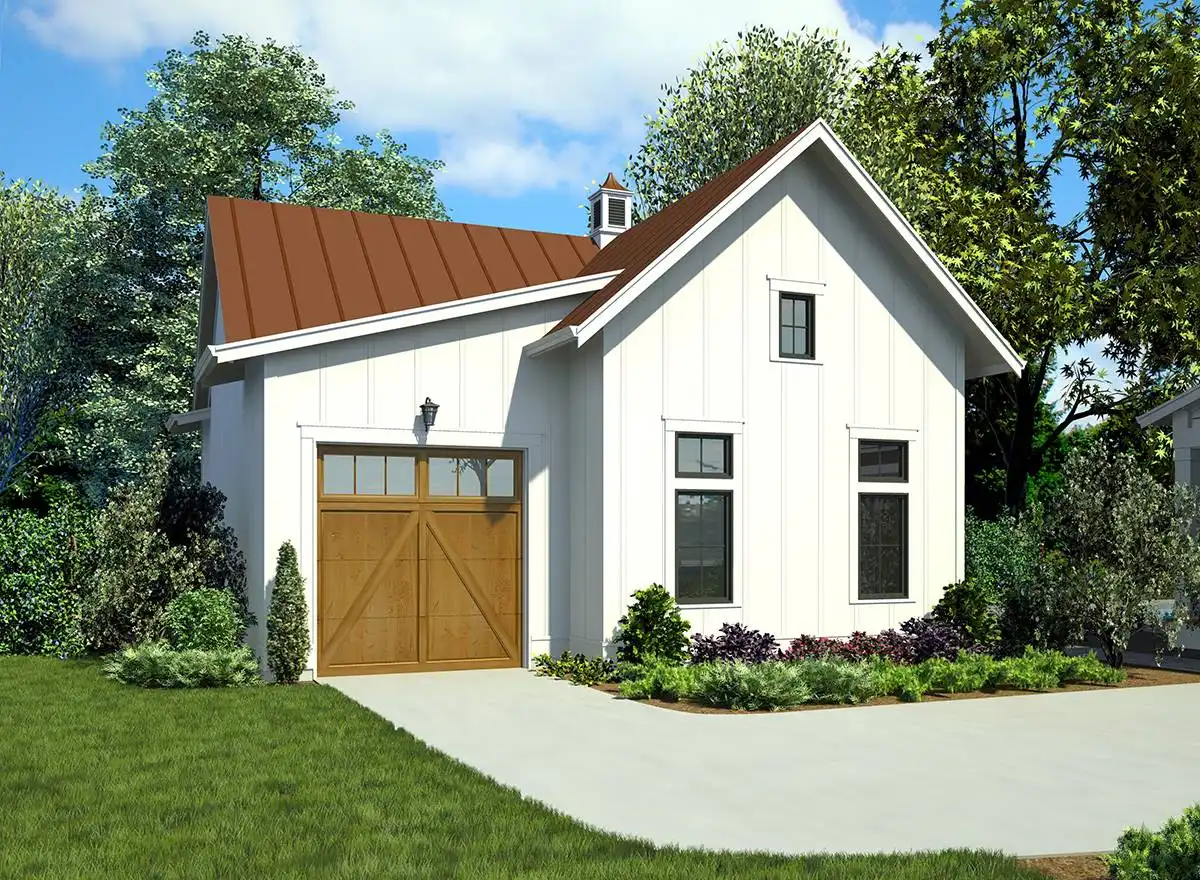 The perfect addition to any home, House Plan 7454 is a beautiful country-style cabana that is sure to enhance your outdoor living experience. Great for a poolside location or simply functioning as a guest house, this 995-square-foot plan can fit virtually any lifestyle. It also features a 2-car attached garage, as well as a fully appointed kitchenette, a bathroom, and even a walk-in closet. This space has ample storage and endless uses! Open the sliding front barn doors and enjoy a day by the pool while retreating to your cabana for lunch with the family, or simply set the space up to house guests that come to visit--the choice is yours! You are sure to love this great plan and it will surely add value to your home!