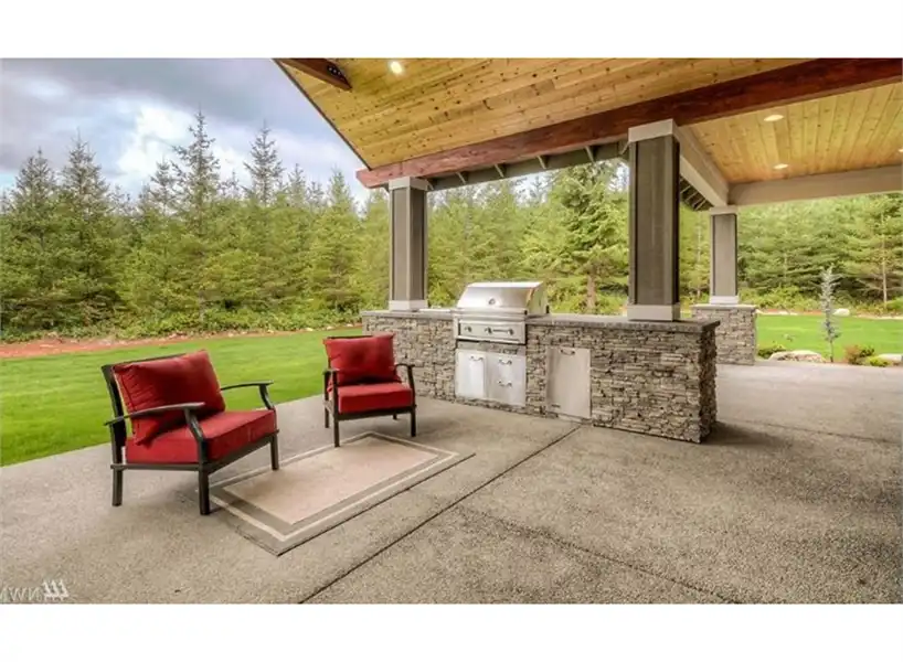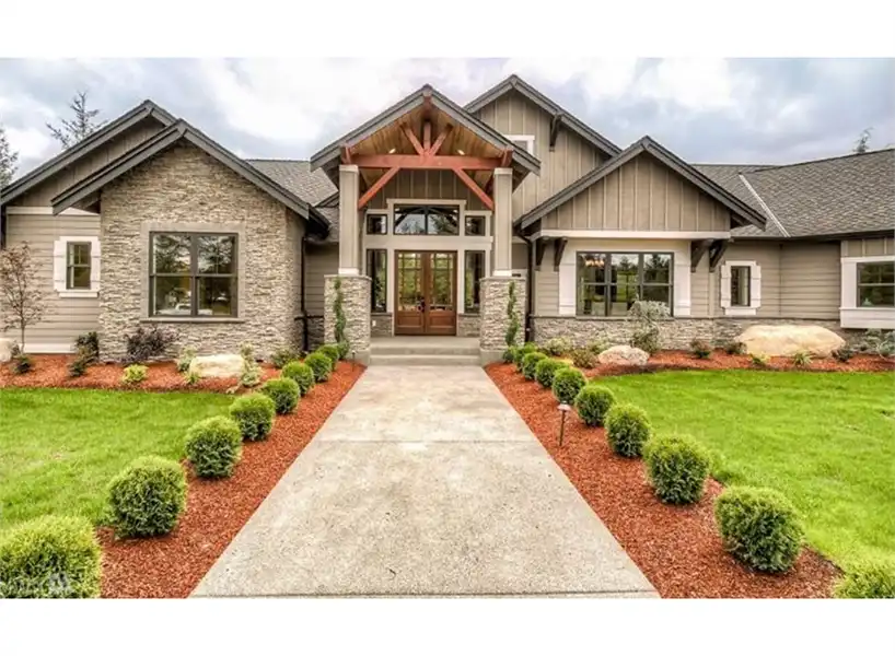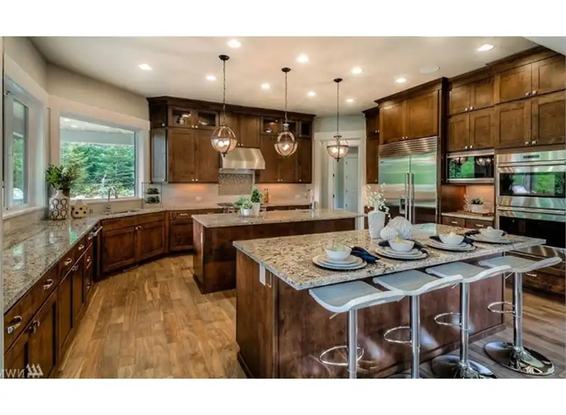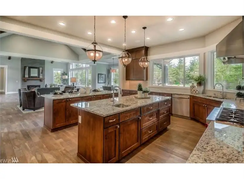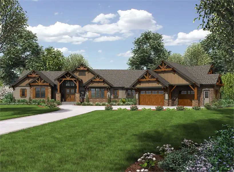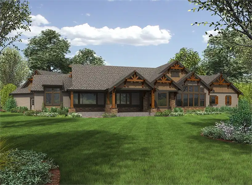 House Plan 7466 is downright outstanding with 3,270 square feet, four bedrooms, three-and-half bathrooms, and ample common space across one sprawling level. The common areas make up the heart of the home, with a vaulted great room straight inside the foyer. It features a two-sided fireplace that it shares with the heart room on the other side. From front to back, there's the dining room, then the hearth room, then the breakfast nook with access to the outdoor living and kitchen. This lineup of informal spaces is overseen by the luxe U-shaped kitchen with two islands. Just imagine the hosting possibilities! The five-piece primary suite is tucked behind the kitchen and near the laundry/mudroom coming in from the garage while the other three bedrooms are across the house. With a pair of Jack-and-Jill bedrooms and a private bedroom suite, there's room for the whole family and guests!