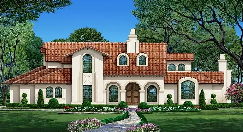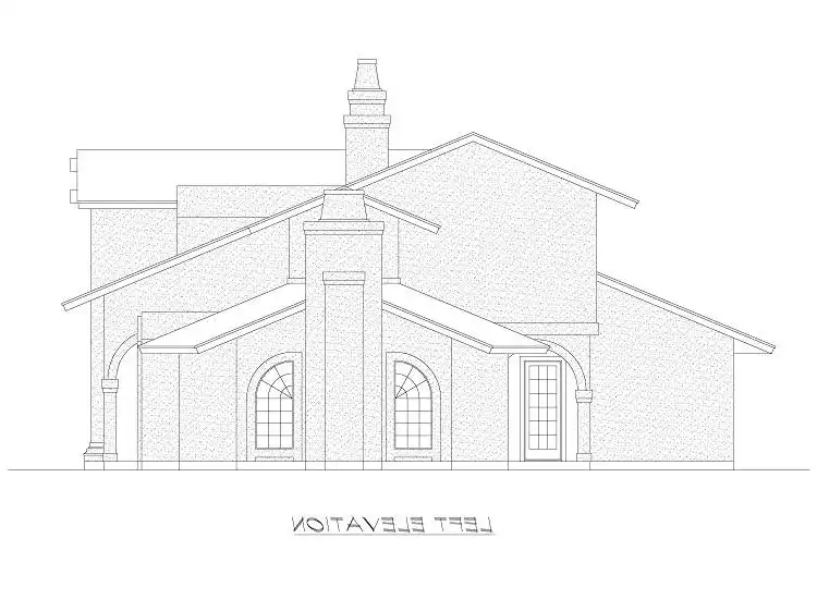 This European style home plan is aesthetically pleasing. With the well-lit grand entrance and French door, you will get that luxurious feel as you step inside. The grand foyer opens immediately into the family room, complete with a wet bar and built-in seating, floor-to-ceiling windows offer views to your landscaped back yard. A sensational, quiet study with warming fireplace and vaulted ceiling shares space with a vaulted sitting room to the left of the family room and grand foyer. Adjacent to the right of the foyer is the elegant dining room which seamlessly is separated by the kitchen’s eating bar. The gourmet kitchen offers a free-standing bar, a built-in booth, built-in modern, state-of-the-art appliances, granite counter tops, pantry, and a utility room. Behind the dining room and kitchen is a lovely bedroom with walk-in closet and full bath. This bedroom offers access to the outdoor patio. Off the family room, stairs rise to the second floor where a bedroom with vaulted ceiling is part of the two-story double transom and offers a large walk-in closet and full bath. The entire rear of the second-floor plan holds the master suite that boasts a fireplace, luxurious master bath with his and hers vanities, separate glass shower and marble tile tub, a walk-in closet and wardrobe with built-ins and a vaulted exercise room. A three-car, side entry garage with access to the back yard and the hall behind the dining and kitchen areas, completes this luxury European house plan.