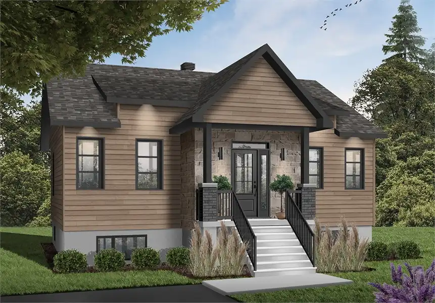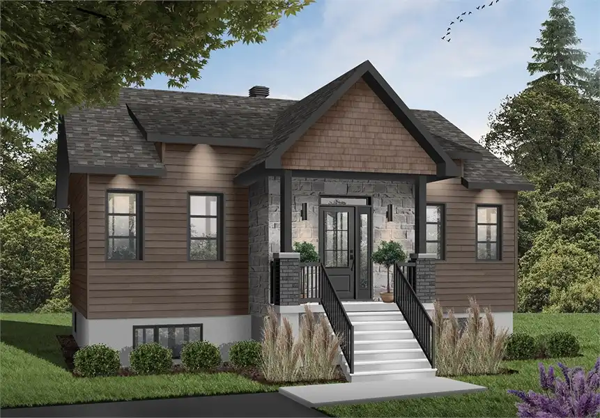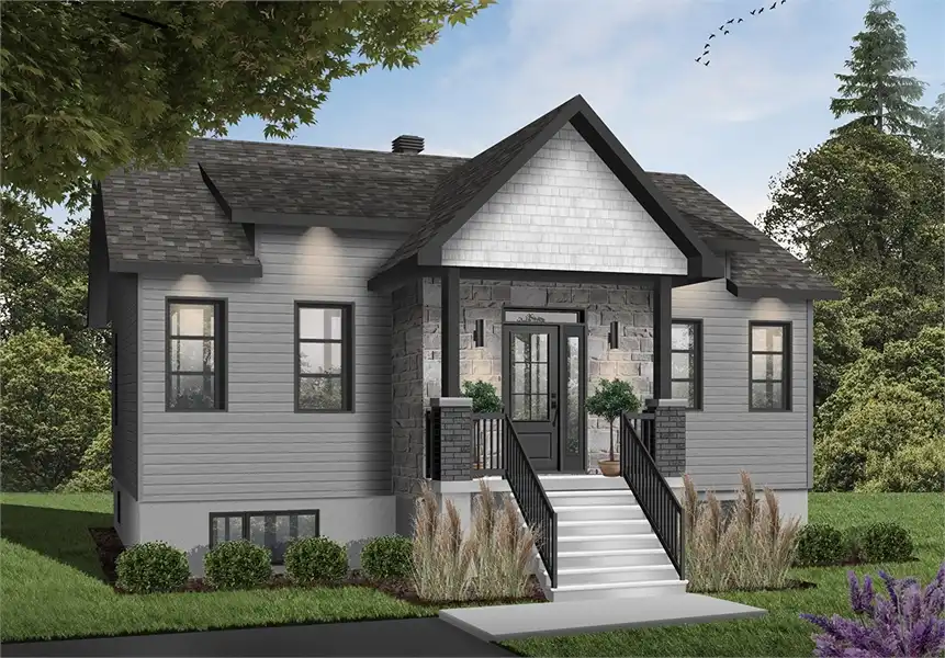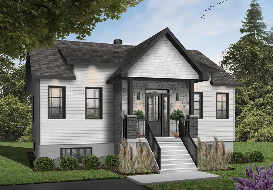 Modern craftsman 2 bedroom affordable bungalow plan with great kitchen, huge pantry et open floor plan concept.