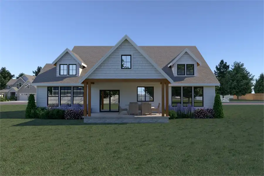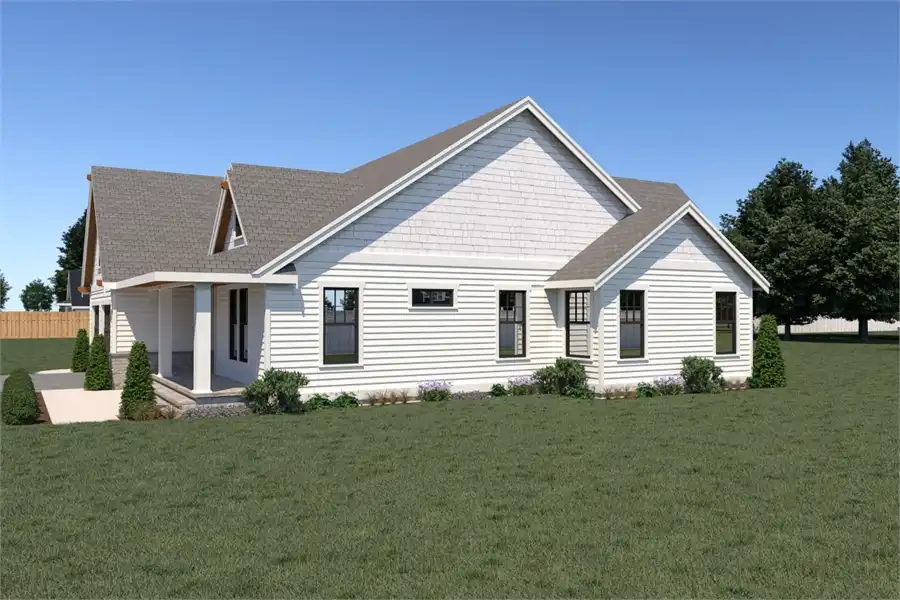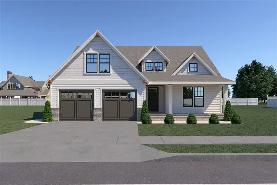 This affordable Country style house plan offers 1,784 square feet, 3 bedrooms and 2 bathrooms. This home is down-to-earth with a bit of flair. You will love this home from the first drive up, thanks to its immense, modern curb appeal that blends the strikingly new with the much-loved traditional. Past the covered front porch and two car garages, you enter into the home and find yourself in the front entryway. To your immediate left, two auxiliary bedrooms share a full bathroom, before the home progresses further inside and into the open concept main living spaces. Here you will enjoy a quaint eat-in kitchen, which joins with a dining nook and a vaulted family room to create a cozy and welcoming space. A covered patio is available off of the kitchen, as is the private master suite, complete with a relaxing bath and a sizable walk-in closet.