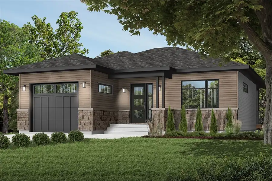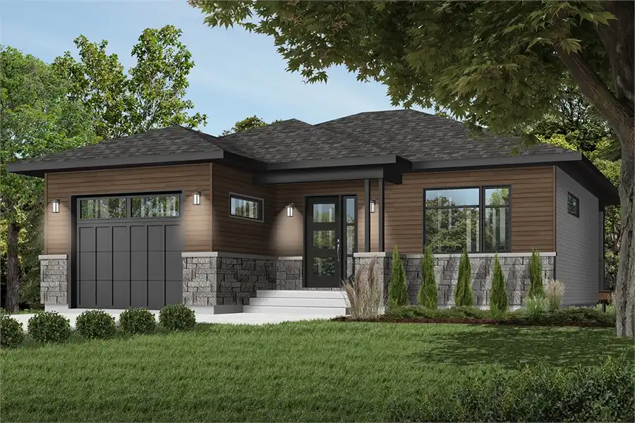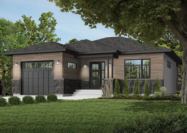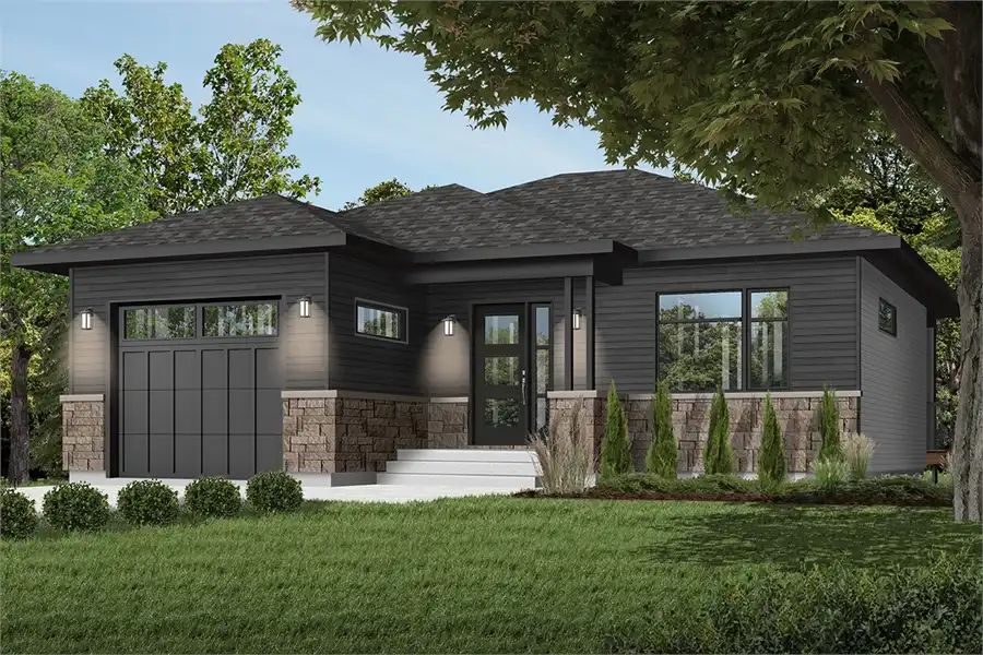 797 square feet flows throughout an open and accessible single-story layout, offering 1 bed and 2 bathrooms. The perfect home for those looking to downsize or searching for their first build, this beautiful single story modern plan is a wonderfully affordable option. The striking front façade draws your eye, with simple and sleek lines beckoning you inside. As you move past the single car garage, the foyer gives way to the open concept design. The living room and full island kitchen are connected and spacious. Nearby is the comfortable master bedroom, complete with a full en-suite and a large walk-in closet for added convenience. For those who love entertaining, this home has the added bonus of a covered rear porch, perfect for enjoying the outdoors all year long. If more space is needed, fear not, this plan features a full basement which can be expanded to add a whole bedroom, bathroom and private living area!The perfect home for those looking to downsize or searching for their first build, this beautiful single story modern plan is a wonderfully affordable option. 797 square feet flows throughout an open and accessible single-story layout, offering 1 bed and 2 bathrooms. The striking front façade draws your eye, with simple and sleek lines beckoning you inside. As you move past the single car garage, the foyer gives way to the open concept design. The living room and full island kitchen are connected and spacious. Nearby is the comfortable master bedroom, complete with a full en-suite and a large walk-in closet for added convenience. For those who love entertaining, this home has the added bonus of a covered rear porch, perfect for enjoying the outdoors all year long. If more space is needed, fear not, this plan features a full basement which can be expanded to add a whole bedroom, bathroom and private living area!