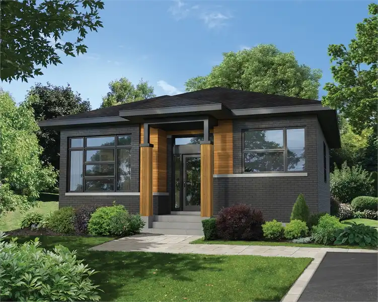 Affordable single-story contemporary house plan is perfect for a first home, ADU or urban development with small lot sizes. There’s 2 bedrooms and a full bathroom that join the 1,025 square foot open floor plan to create a sensible and functional small home. The open living spaces include the family room, eat-in island kitchen, and dining room. The backyard is accessible through sliding glass doors off of the dining room. The two bedrooms are off of the kitchen, both equally comfortable, with one featuring a walk-in closet, a great addition for any smaller home! A full bath is conveniently around the corner with a separate tub and walk-in shower.