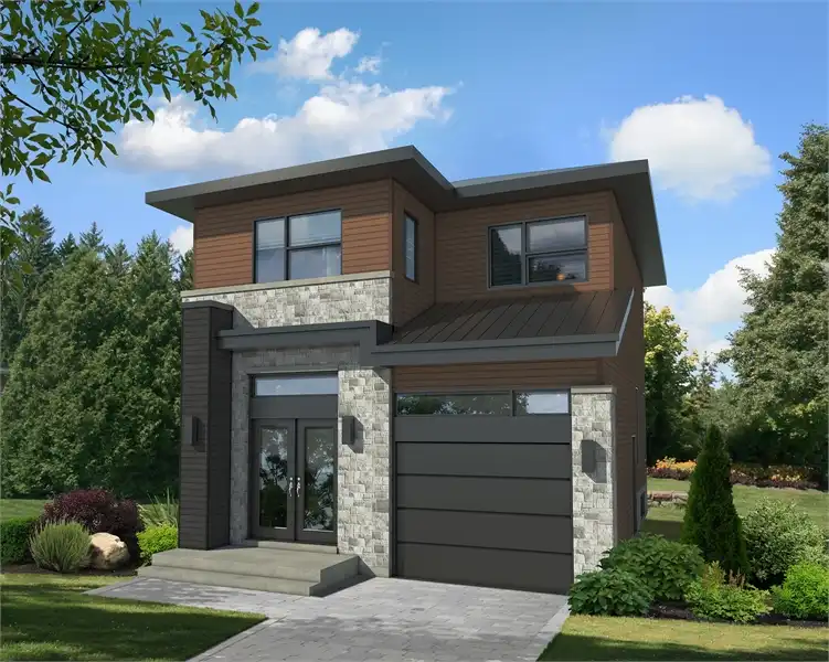 This narrow two-story, modern 1,318 s.f. house plan is perfect for a confined lot with a 24’ 10” x 34’ footprint. A convenient single car garage sits next to the front entryway before they both give way to the foyer. A discreet powder room is nearby, great for guests. The main living spaces make up the rest of the first floor, including the family room and dining room which join together with the island kitchen for a totally accessible level. Upstairs you’ll find 3 bedrooms and a full bath with a soaking tub.