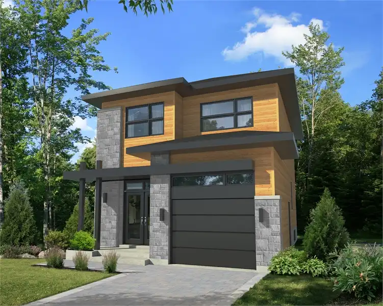 Simple and affordable 2-story contemporary house plan featuring 1,377 s.f. is designed to fit any lot size. An attached single car garage conveniently opens to a small foyer and powder room. The living room opens to the island kitchen with small island seating and a cozy dining room. Upstairs finds three large bedrooms, as well as a full bath. The bedrooms are extremely flexible, able to be used as other spaces such as an office or home gym, or even a rec room, the choice is yours!