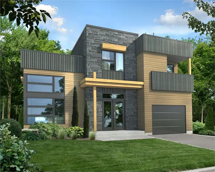 This ultra-contemporary 2-story house plan features 1,755 square foot with open first floor concept featuring two comfortable living spaces, an L-shaped kitchen with island seating and formal dining room. A covered rear porch is great for grilling and is conveniently off of the kitchen and dining room. Upstairs finds two full bedrooms and a bath with separate walk-in shower and soaking tub.