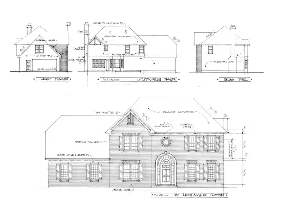 Five printed sets of house plans