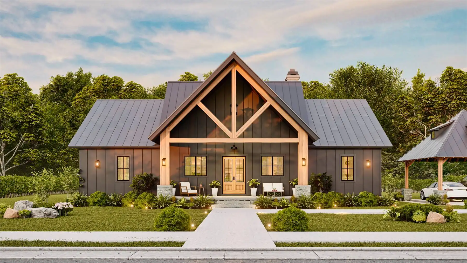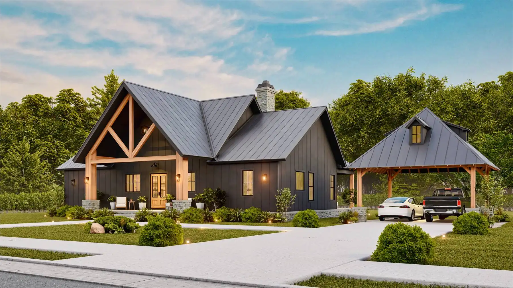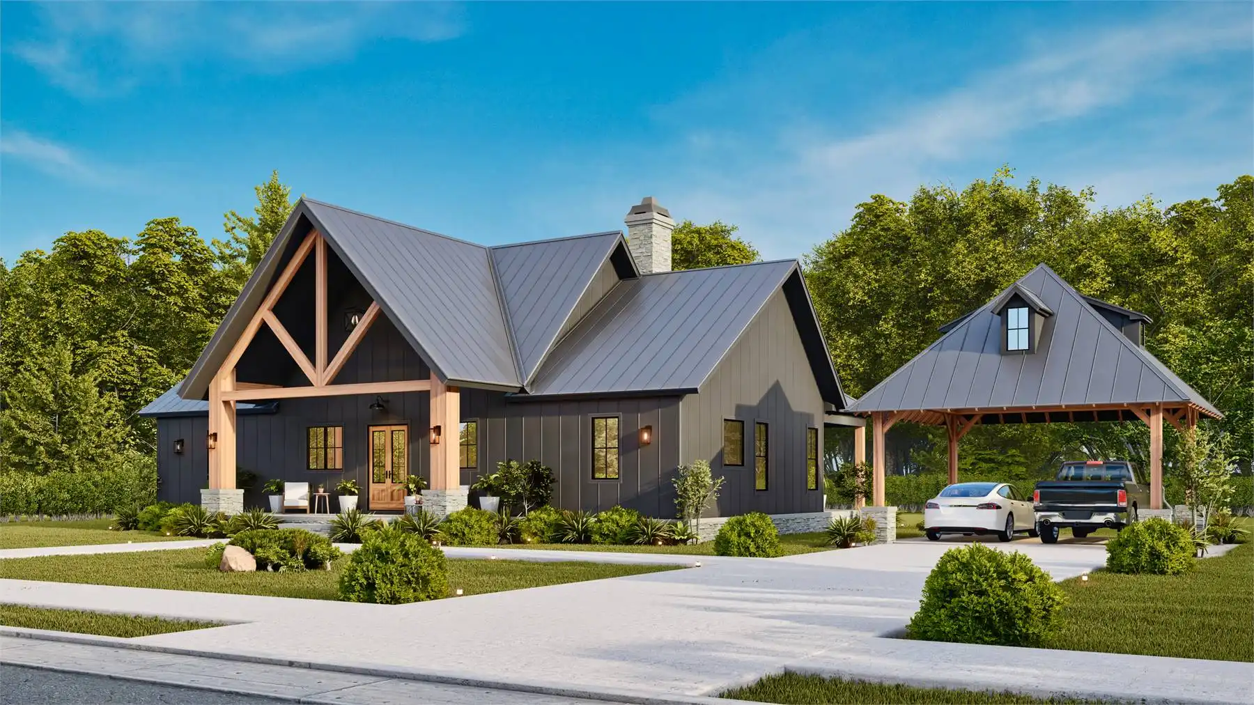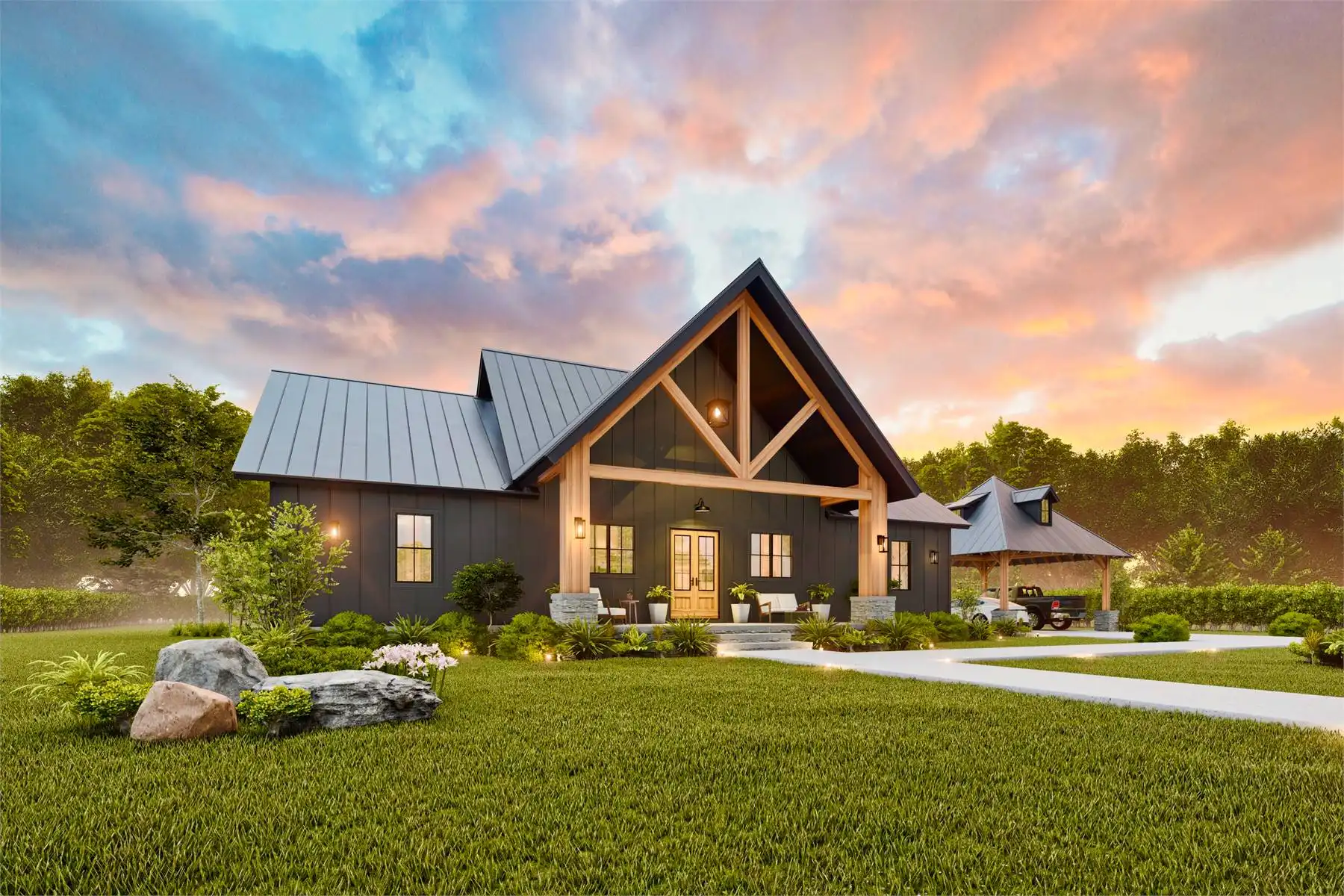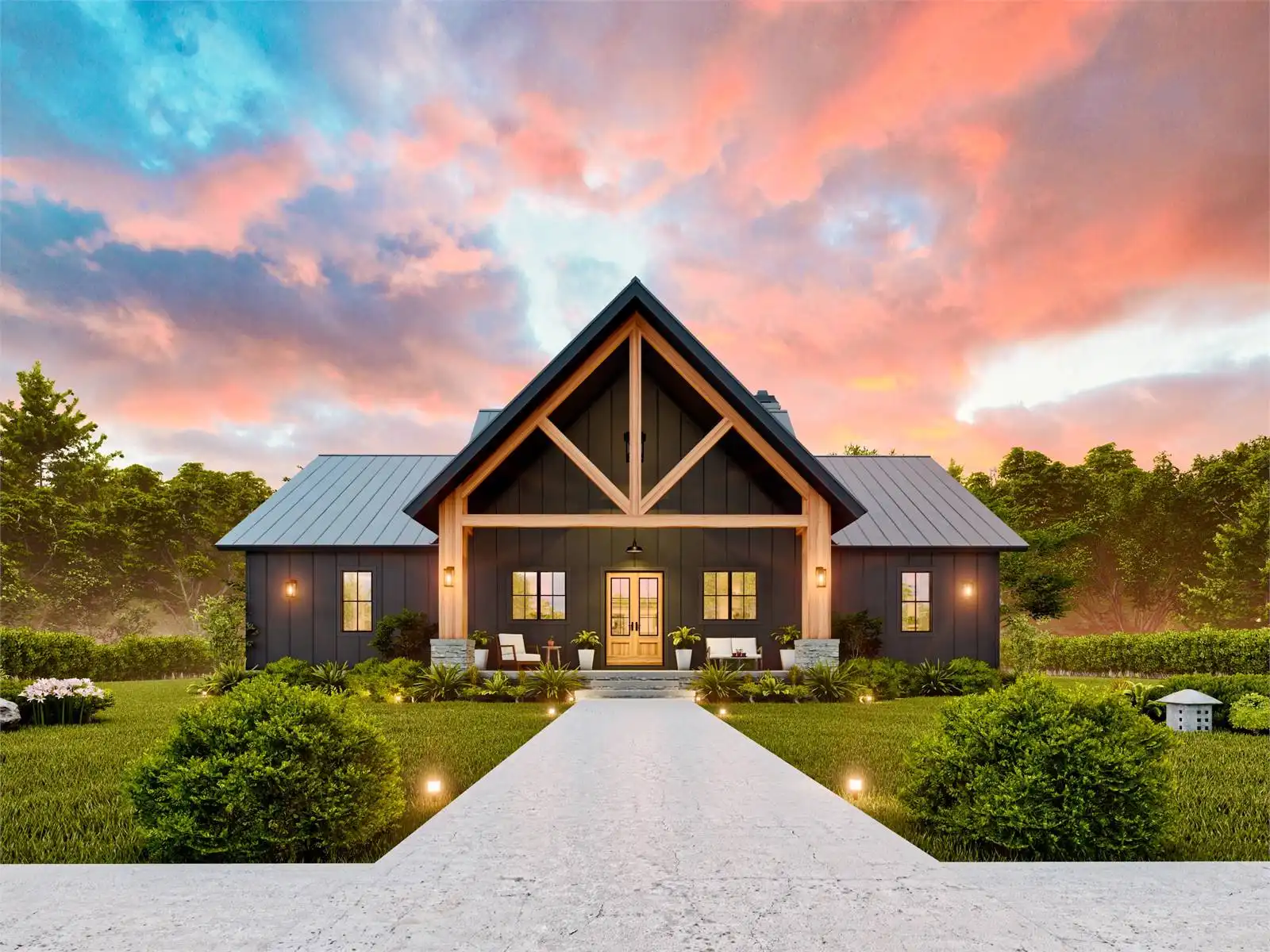 Step into an alluring 1,849 square foot modern farmhouse that seamlessly combines style with the tranquility of country living. Upon entering, discover an elegant L-shaped kitchen to the right, complete with a spacious island and ample counter space. Progressing forward, the Great Room awaits with its vaulted ceilings, allowing natural light to fill the space through floor-to-ceiling windows. On the right side of the home, two bedrooms share a full bathroom, boasting separate double vanity sinks. To the left, the owner's suite provides a private sanctuary with a large walk-in closet and an ensuite bathroom. This retreat extends outdoors with access to a covered porch spanning the entire rear of the home, offering an ideal space for outdoor living. Adding practicality, a detached garage stands ready for two vehicles.