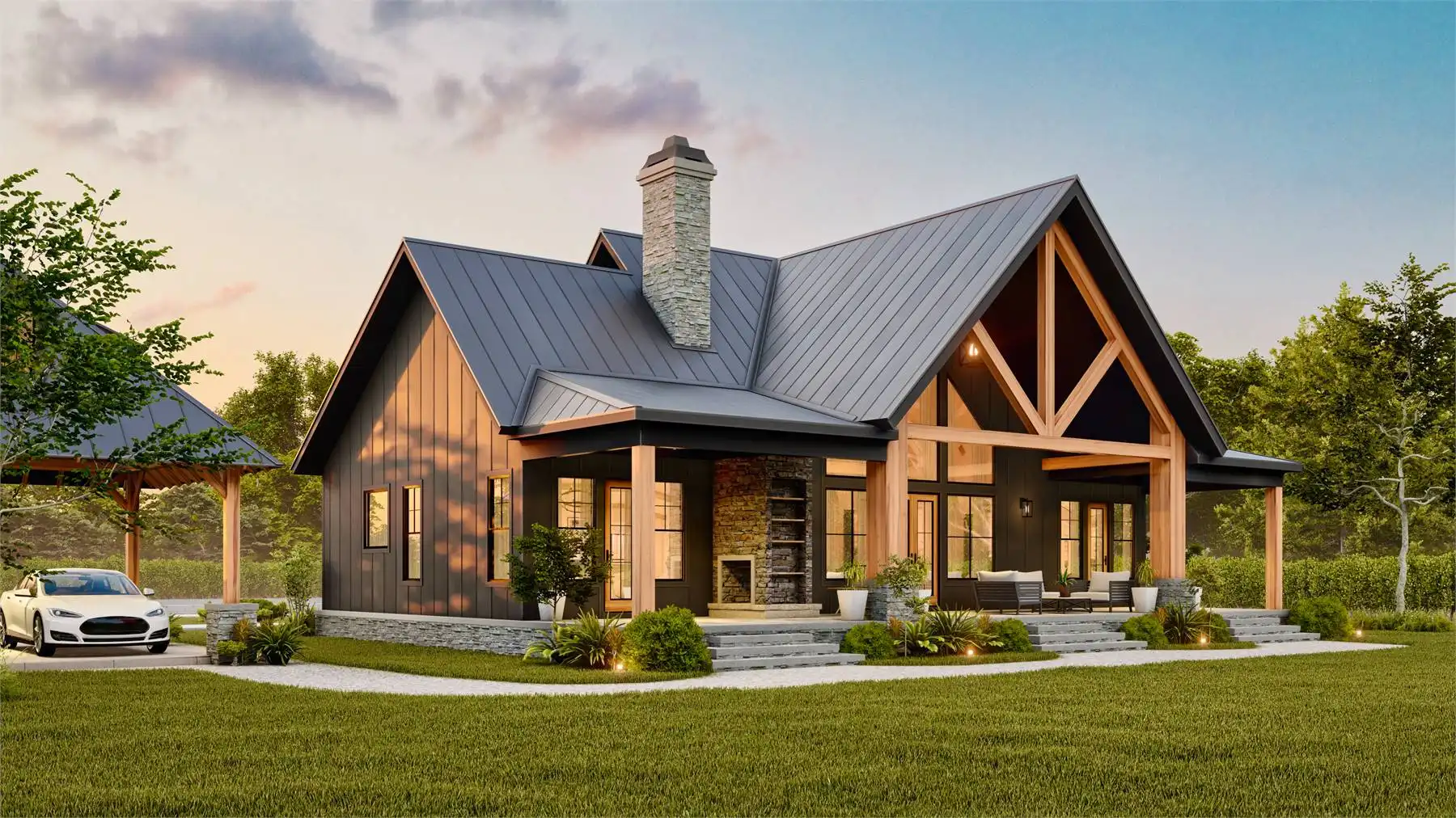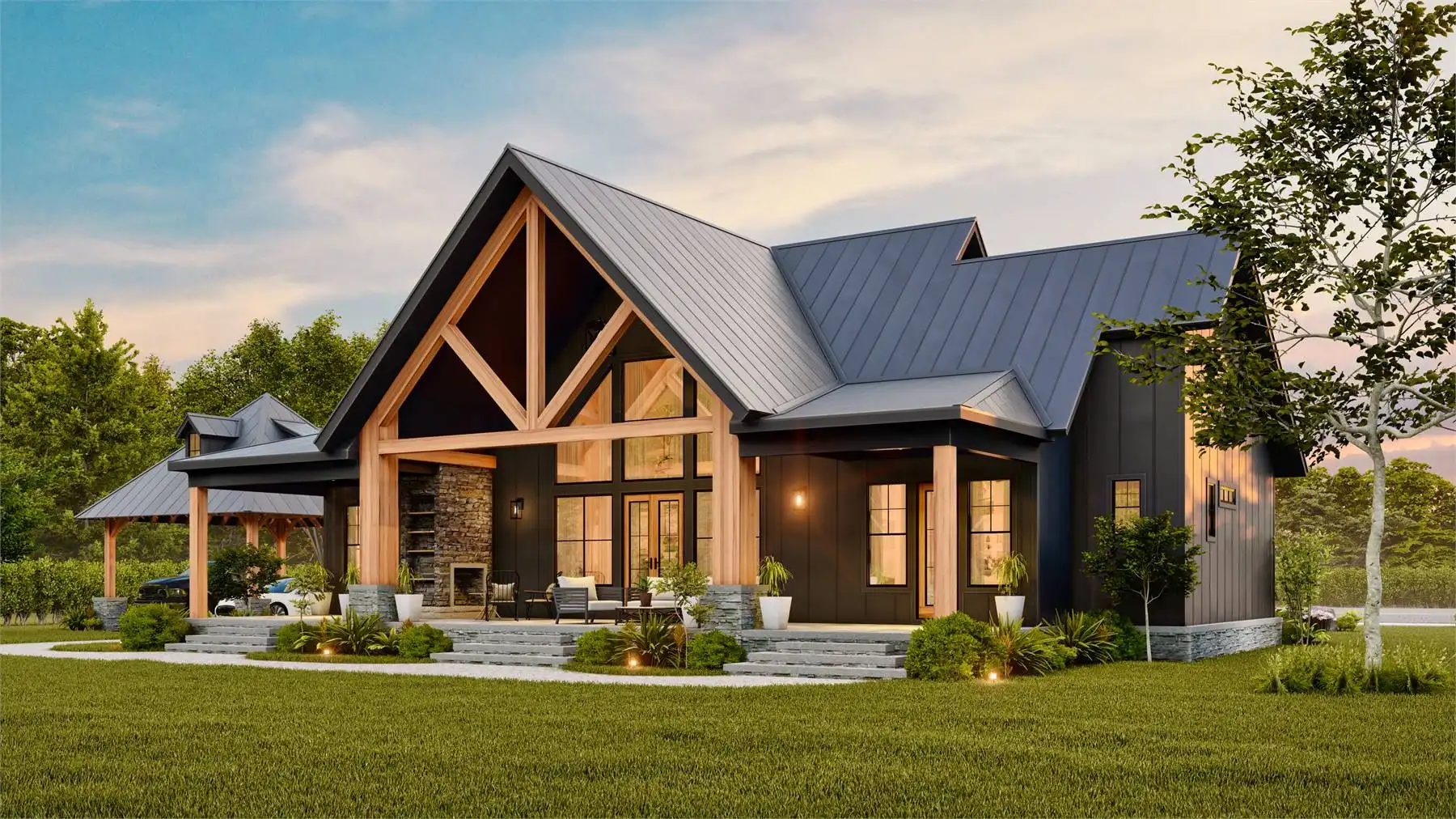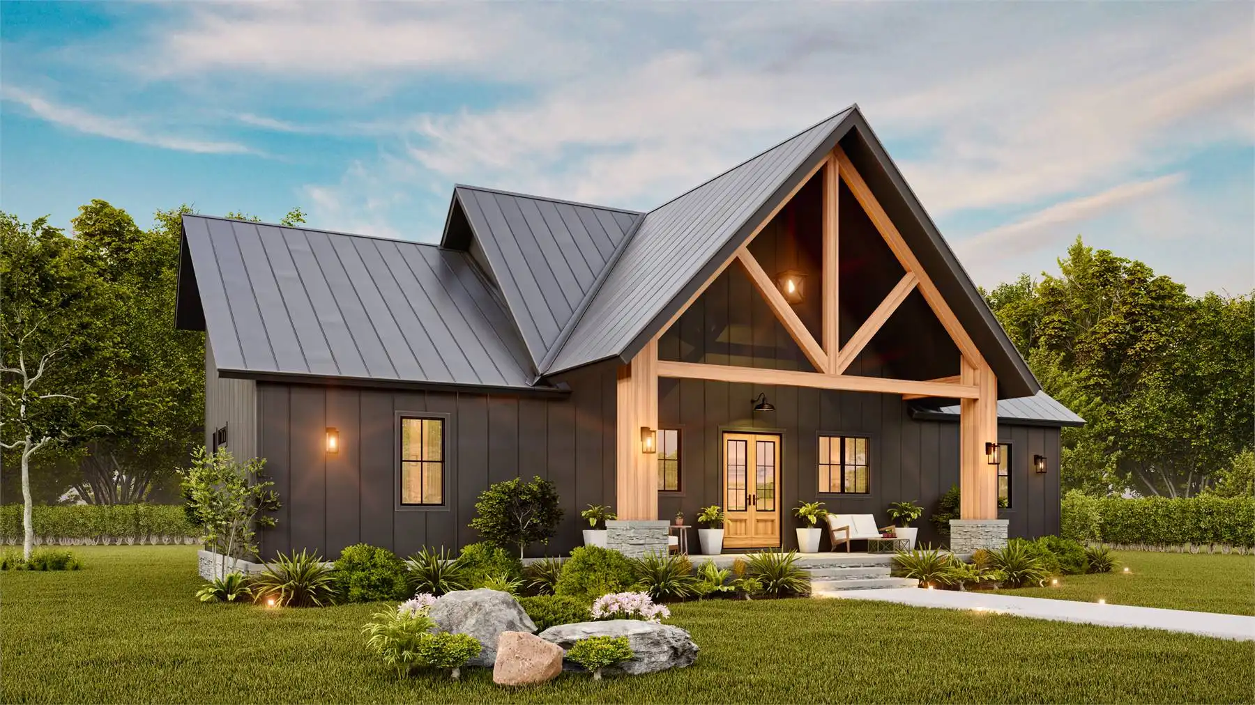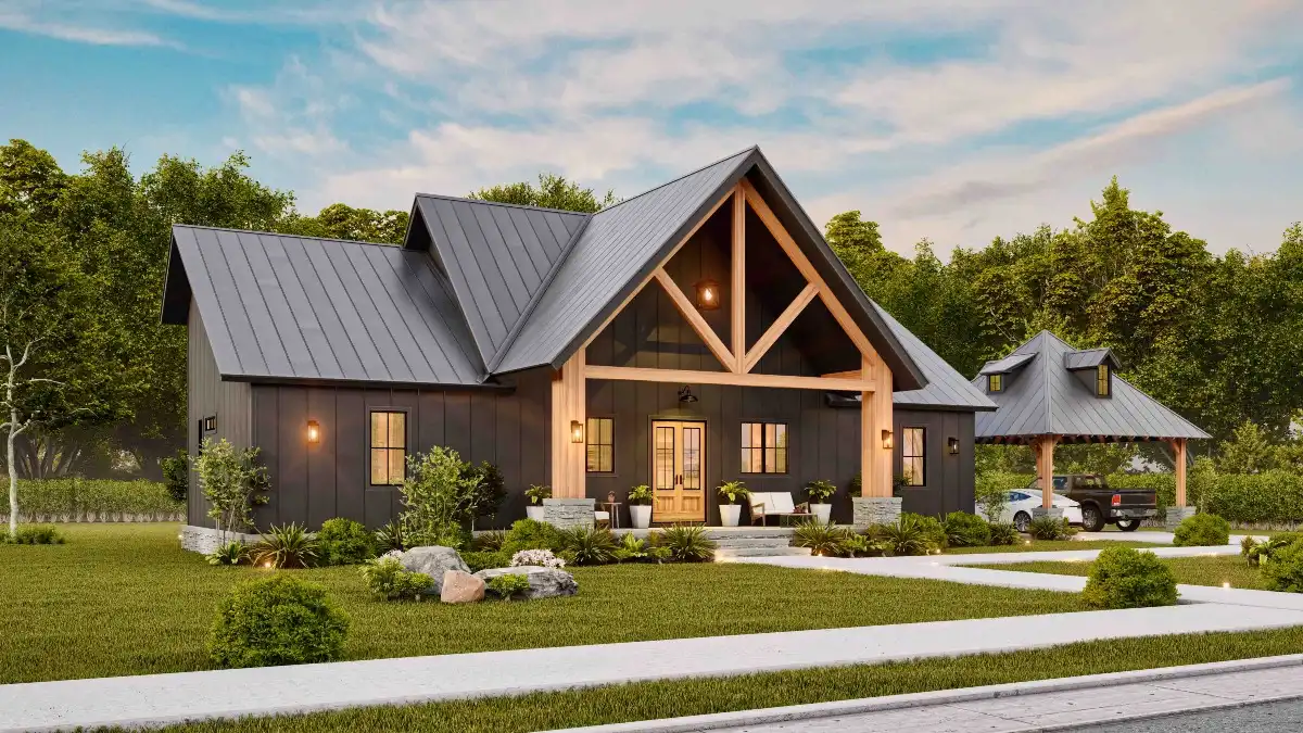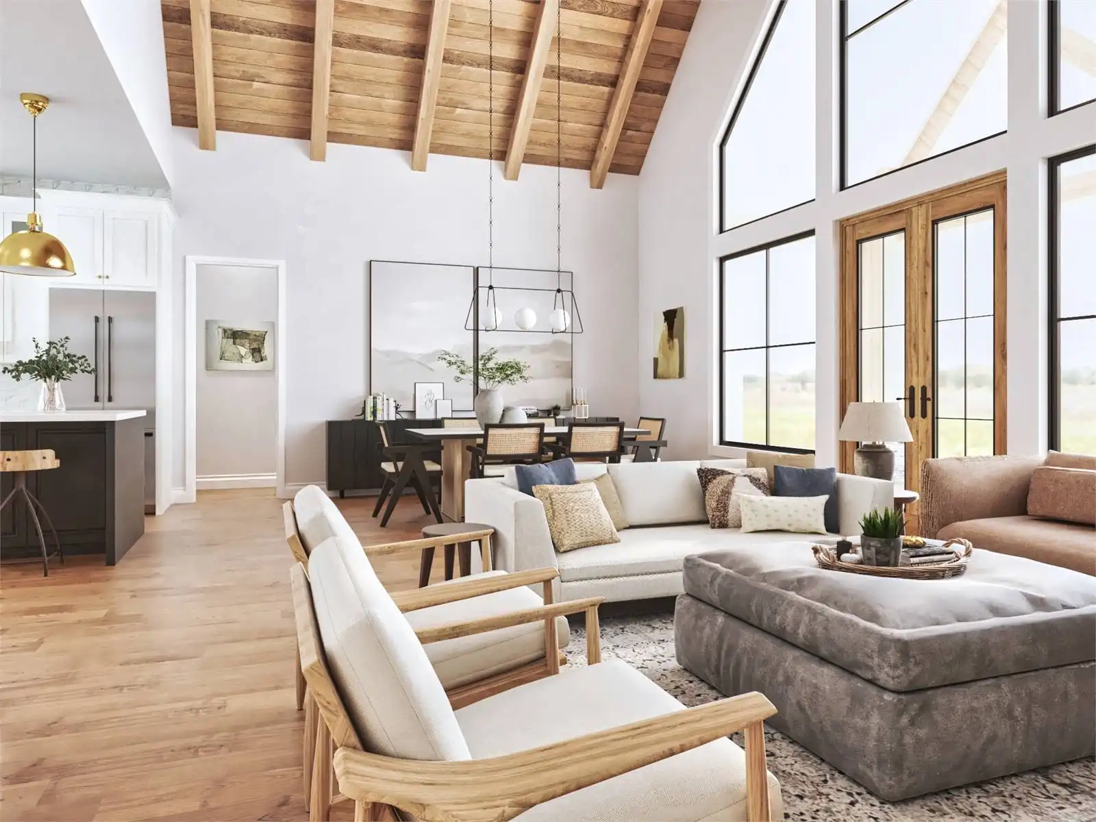 Step into an alluring 1,849 square foot modern farmhouse that seamlessly combines style with the tranquility of country living. Upon entering, discover an elegant L-shaped kitchen to the right, complete with a spacious island and ample counter space. Progressing forward, the Great Room awaits with its vaulted ceilings, allowing natural light to fill the space through floor-to-ceiling windows. On the right side of the home, two bedrooms share a full bathroom, boasting separate double vanity sinks. To the left, the owner's suite provides a private sanctuary with a large walk-in closet and an ensuite bathroom. This retreat extends outdoors with access to a covered porch spanning the entire rear of the home, offering an ideal space for outdoor living. Adding practicality, a detached garage stands ready for two vehicles.