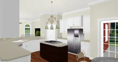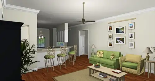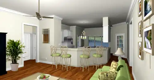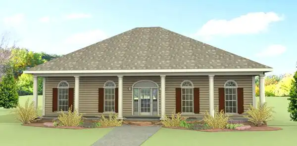 The front and rear porches are a perfect place for the whole family to get together and embrace the great outdoors. As you enter the home you are struck by the open airy view/ The center of the plan is open from the front to the back - great for entertaining family and friends. The kitchen is very open and spacious with cabinets galore, a walk-in pantry, and a raised snack bar. You can teach teach the kids to cook and still be involved with guests in the Great Room. top island. There's a large Dining Area with views out onto the rear through three large windows and french doors. This is a is a split plan to allow private time away from the kids. The Master Bedroom is a serene escape with a walk-in closet and Master bath with access to the laundry. Bedrooms two and three are nice sized and share a bath.