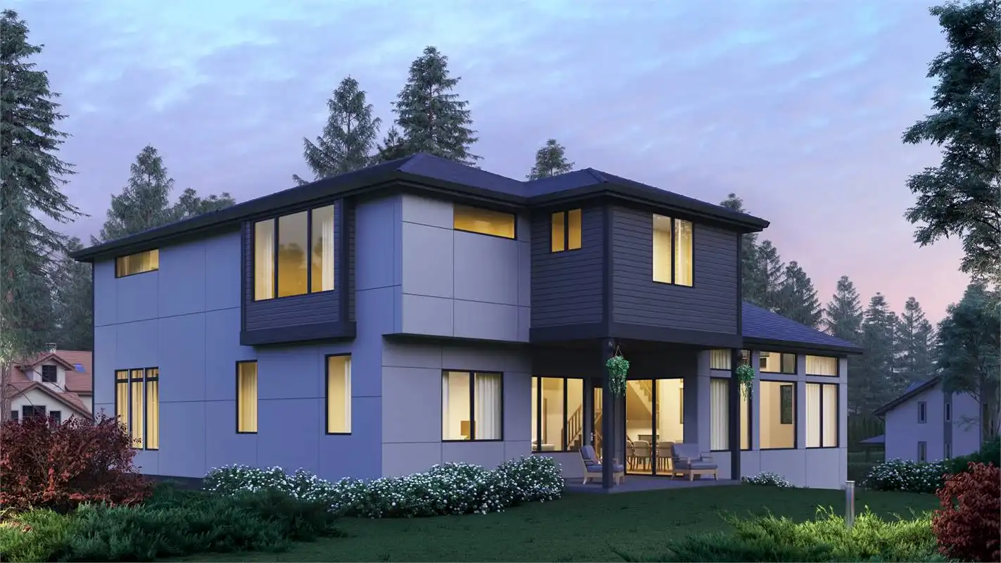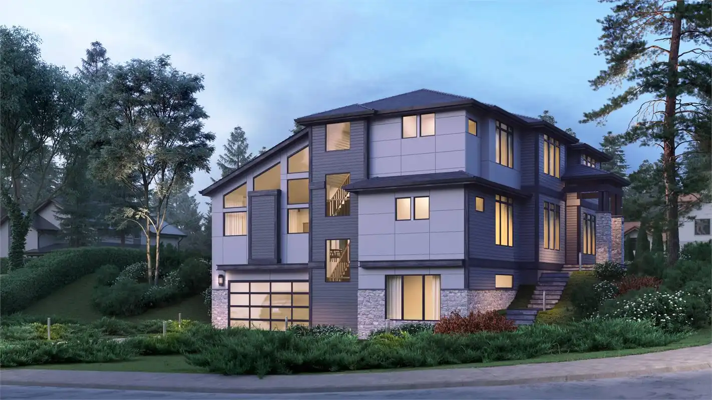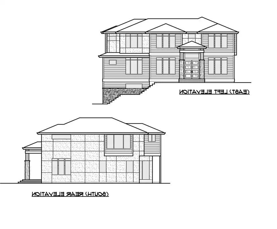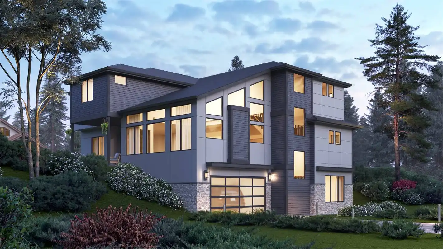 This modern house plan is beautiful and welcoming with 4,417 s.f., 5 bedrooms and lower level garage for a sloping lot. The large windows on the front of the home allows for lots of light even on the gloomiest of days. As you enter the home you'll find a large dining room to your left and Den to your right. A little farther in you'll see a powder bath on your right allowing your guests privacy without needing to use the family bathrooms. The extremely large great room, nook and kitchen are very open and provides a great entertainment space for both family and friends. There is also a guest suite on the main floor. The basement level is where you'll find the media room.