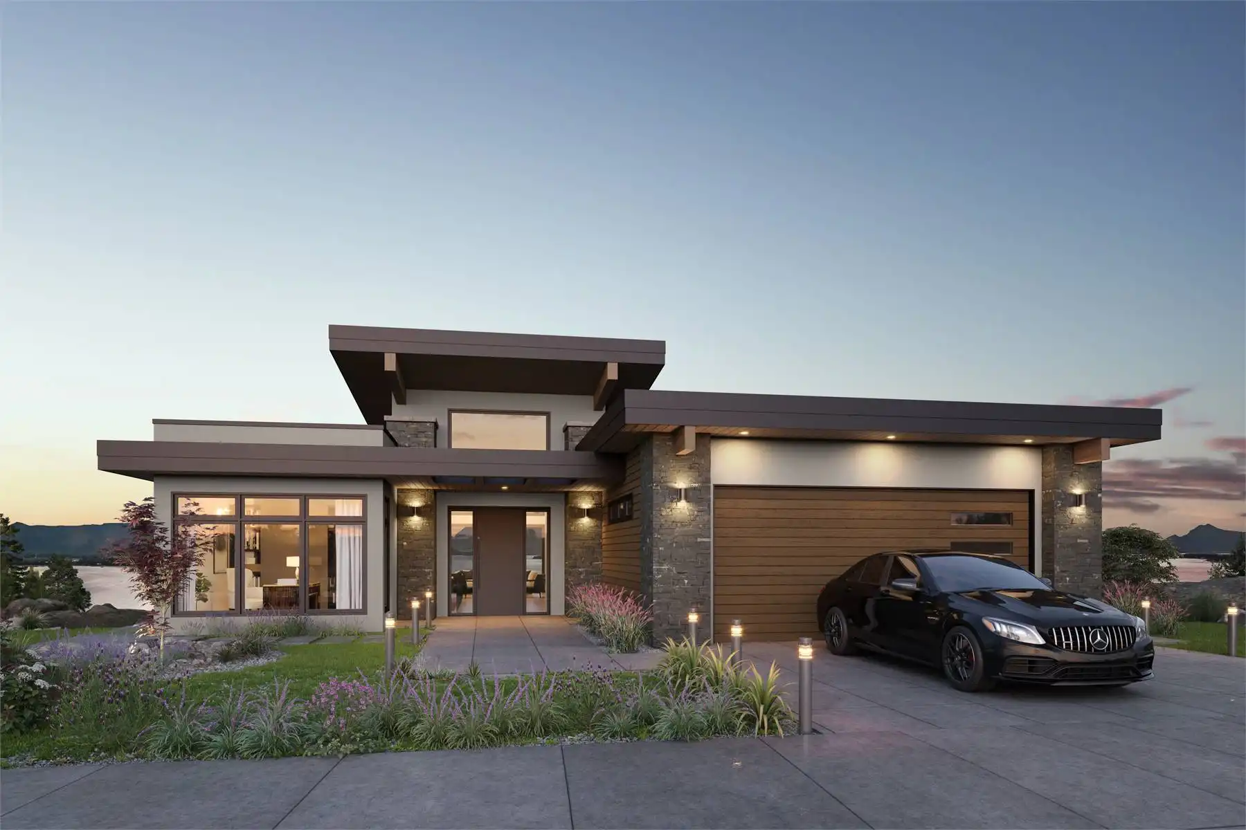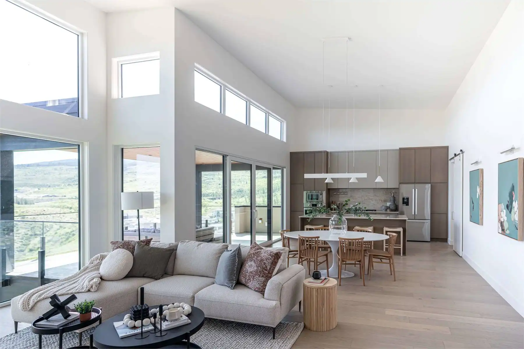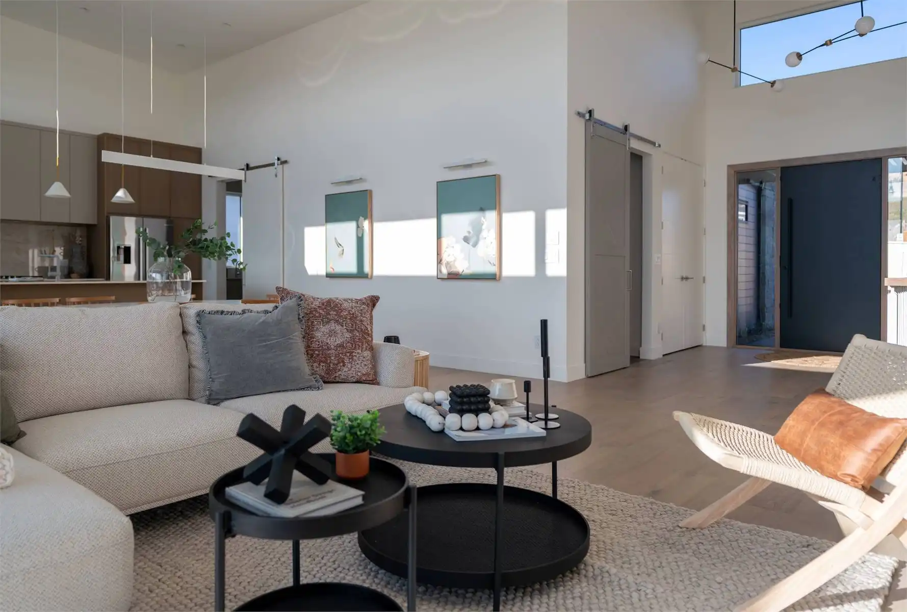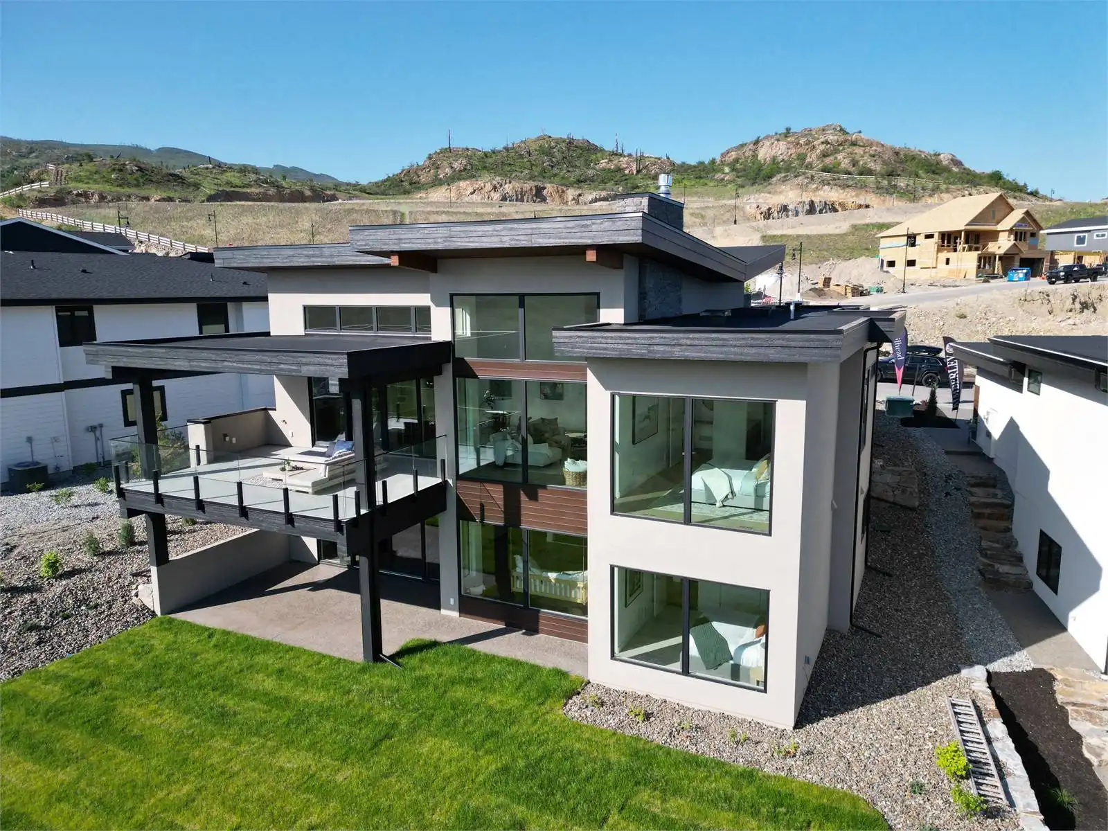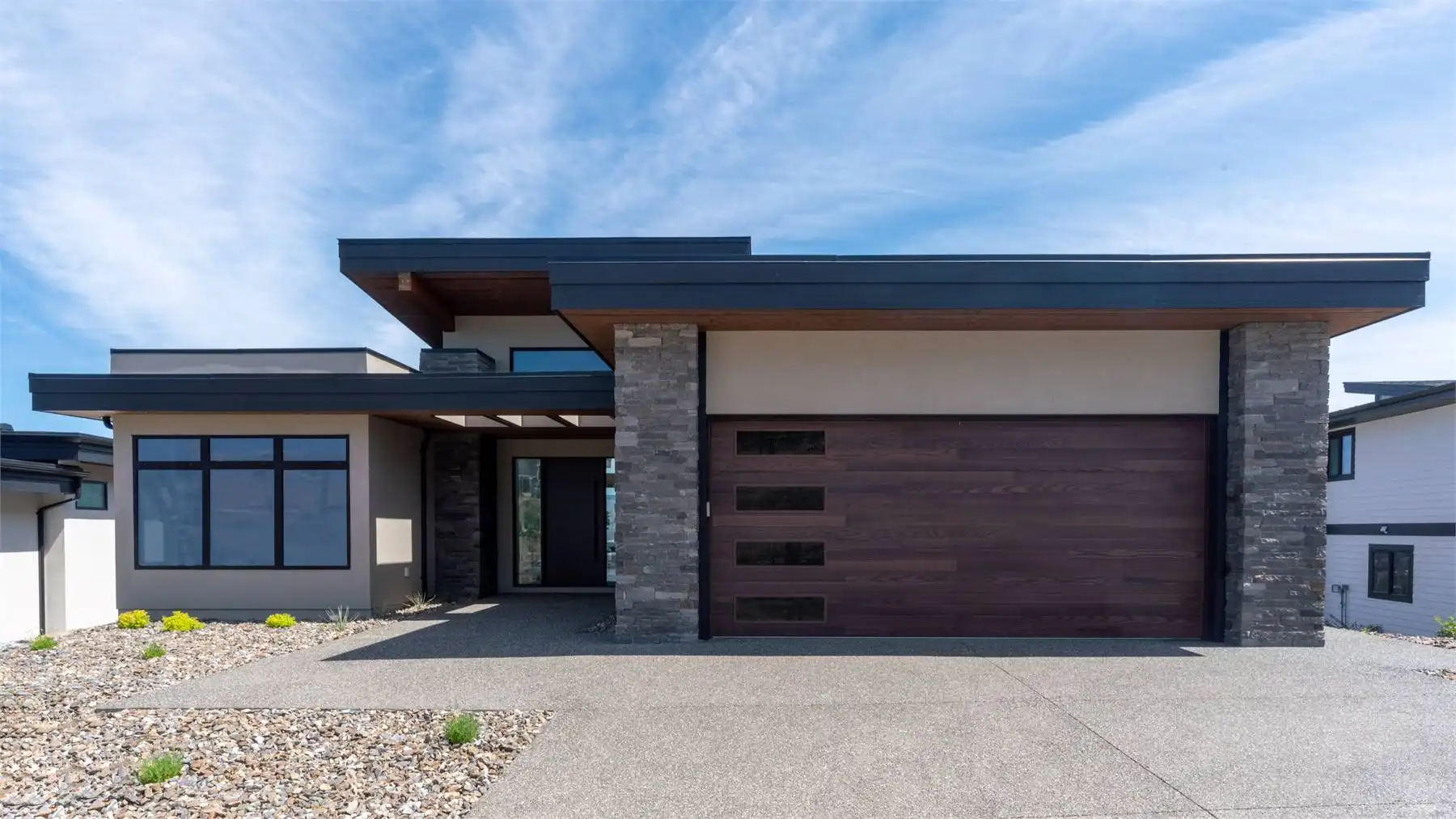 Step into a stunning 3,430 square foot modern masterpiece where every detail is a testament to refined living. The journey begins as floor-to-ceiling windows grace the vaulted ceiling foyer, ushering in natural light that illuminates the elegant interior. To the right, a versatile den awaits, offering potential as an at-home office. The open floor plan unfolds seamlessly, revealing a bright and spacious living room designed for entertaining. The adjacent dining room flows into the meticulously crafted kitchen, boasting a large walk-in pantry and a magnificent island with an eating bar. Access the expansive covered deck from this space, extending the living area into the outdoors. The owner's bedroom, a private sanctuary on the main floor, boasts a generously sized spa-like bathroom with a separate tub and shower. Descend the stairs to discover two additional bedrooms and an abundance of recreational space, providing the perfect canvas for an at-home gym, theater, or games area.