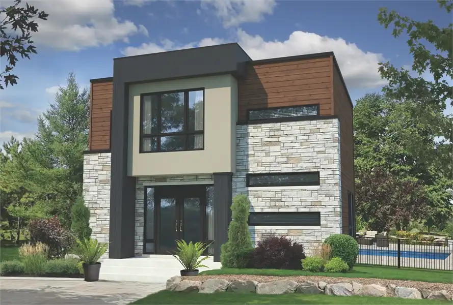 Affordable 2-story contemporary house plan for narrow lot features a 1,620 square foot layout. You’ll enjoy the natural flow that spans the family room, dining room, and island kitchen. Sliding glass doors open directly on to the back yard, a great and sensible option for entertaining. Upstairs is home to 3 bedrooms, including one with a large walk-in closet. If all 3 bedrooms aren’t needed, consider turning one in to a productive home office, or even a playroom for the kids! A full bath with separate tub and shower are also found on this level.