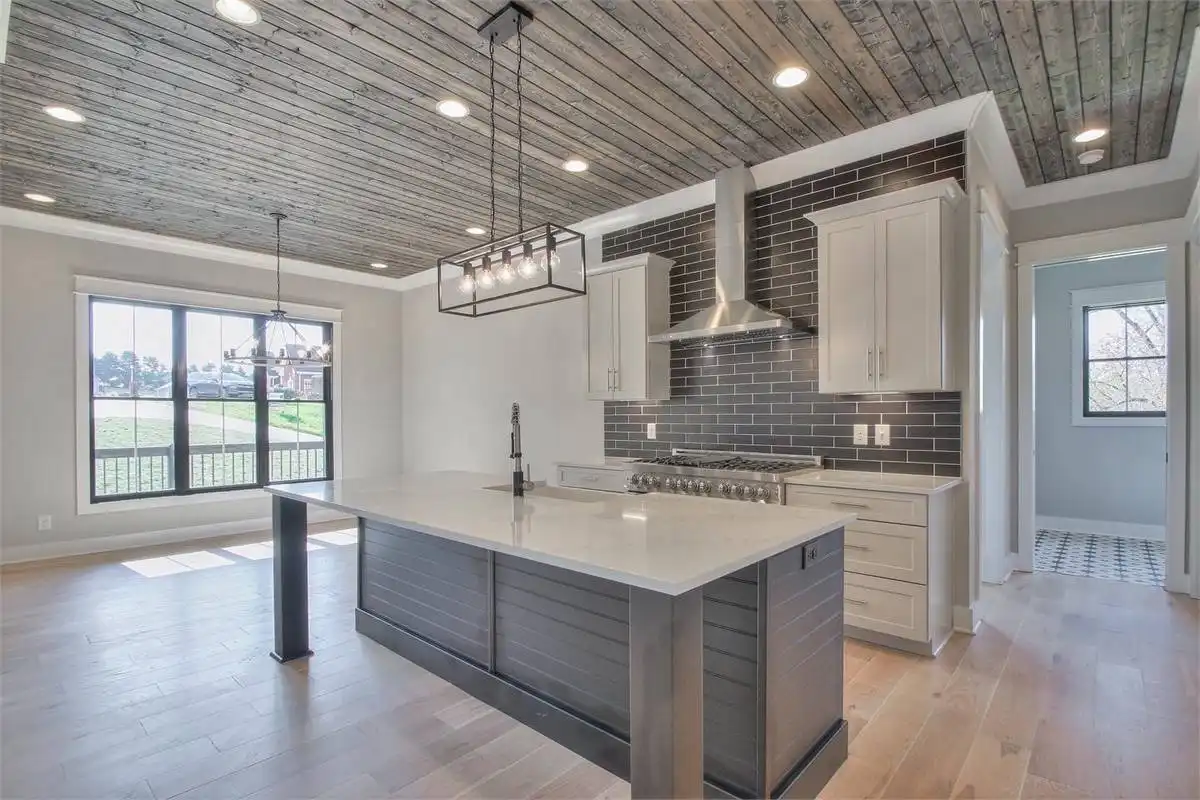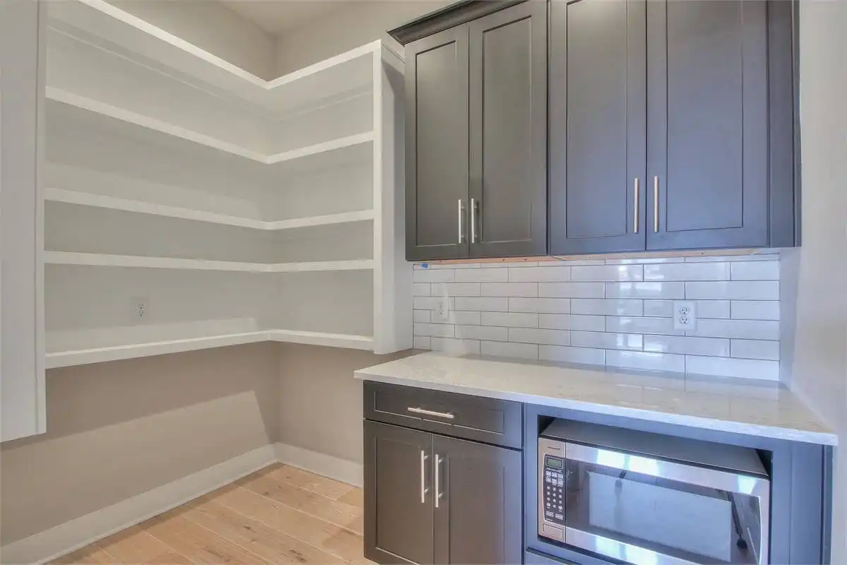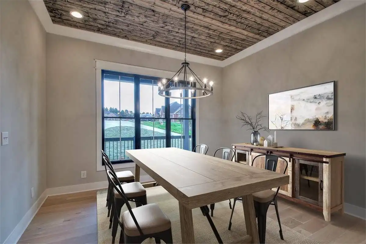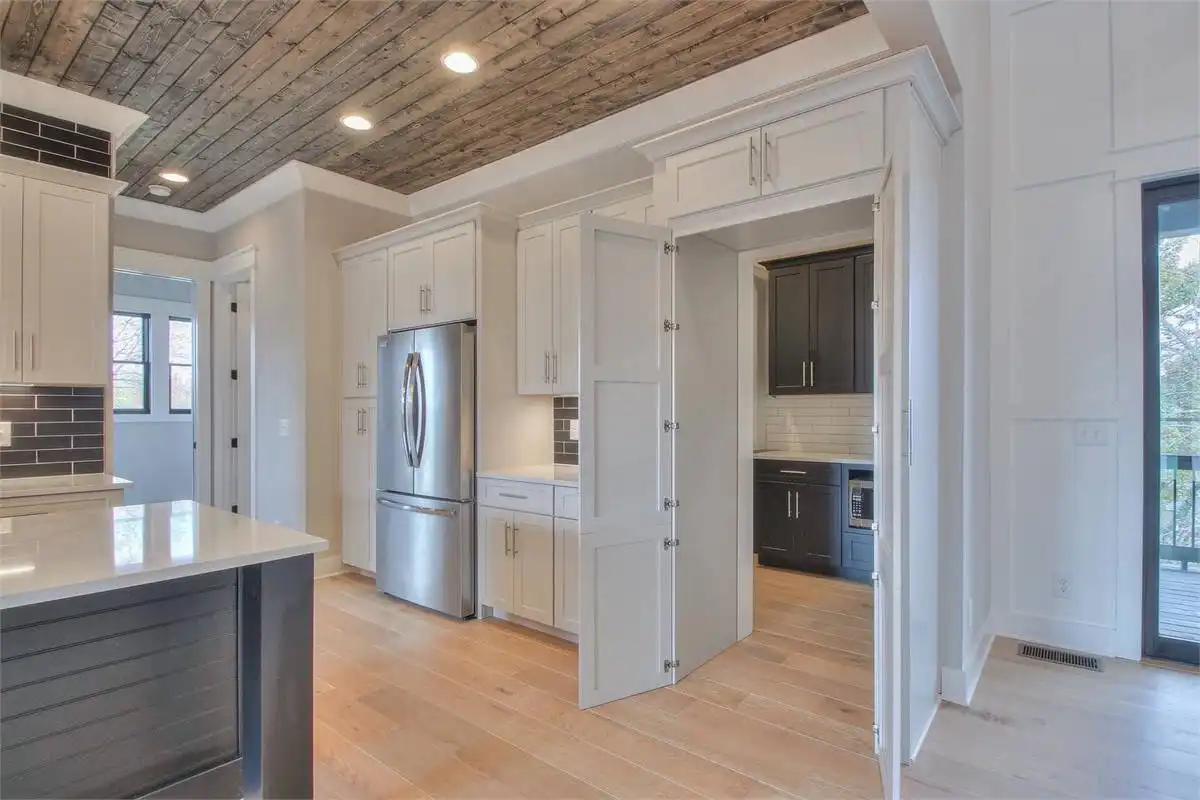 The open concept design melds into the kitchen / casual eating area. The large island has seating for 4 and there are plenty of built-in cabinets for storage. Adding to the wonderful kitchen space is a tucked away prep kitchen, the powder bath, a small pocket office (or hobby room, or additional pantry storage). The 3 car side garage finishes off the back left of the home. It opens into the mudroom / locker / laundry area but also has access to the back porch where you’ll find a shower bath as well as a storage area for backyard play and socializing.