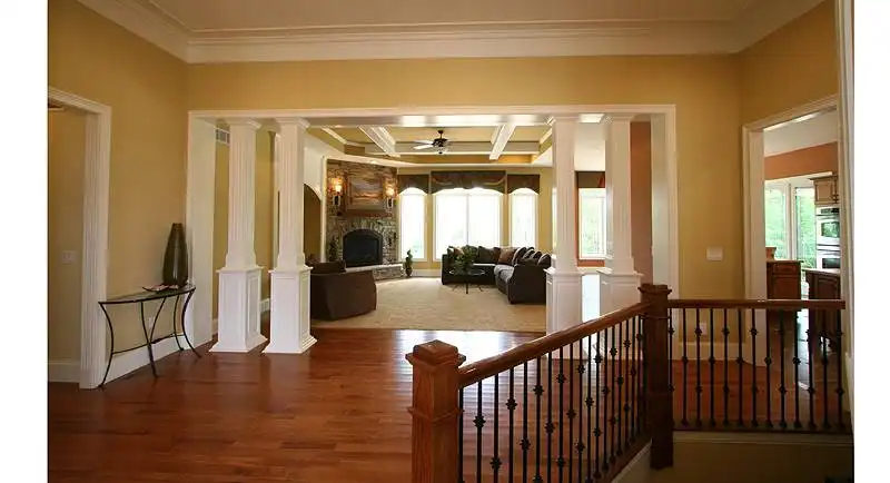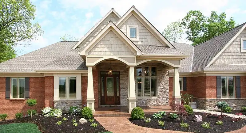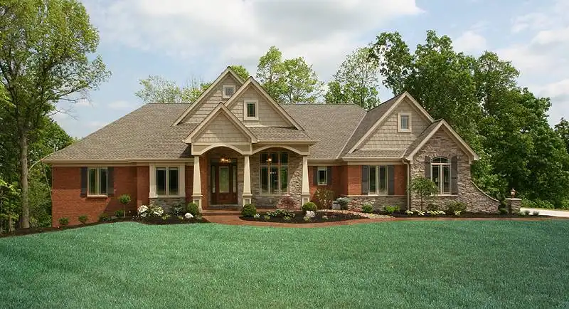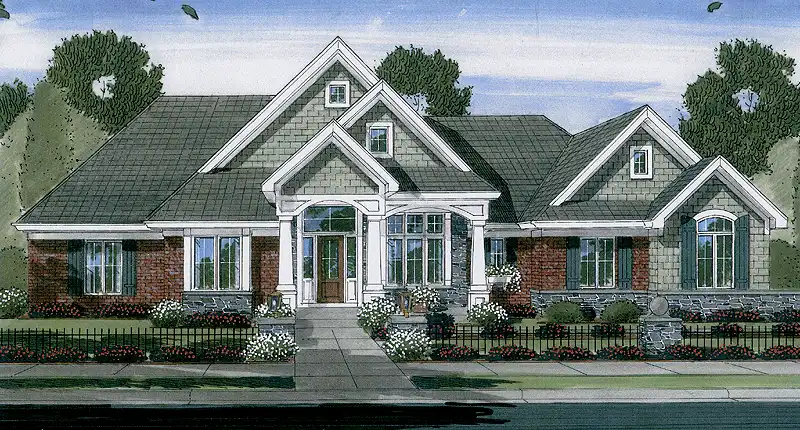 The beauty of this one-level home resonates from the exterior finishes of brick with stone and shakes to the open floor plan with 12' ceilings, multiple windows across the rear, angled walls and luxurious amenities. The great room, breakfast area and kitchen open generously allowing family time and entertainment events to occur in a large combined area. The spacious master suite showcases a whirlpool tub, dual vanities, shower enclosure and walk-in closet. Designed to accommodate an empty nester market, a secondary bedroom provides for overnight guests. A library and mud room offer added spaces for a neat and organized lifestyle. The covered rear porch enjoys a wood fireplace and creates a fun outdoor living space. An attached 3 car side entry garage is an added attraction that offers storage and/or a great place for the automobile enthusiast.