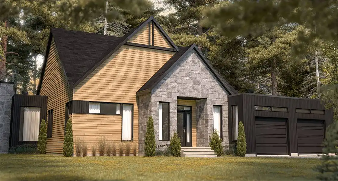 Contemporary home plan offering 3 bedroom, 2 full bathrooms, huge covered rear porch, walk-in pantry and laundry on main. This plan has a beautiful master suite with cathedral ceiling and decorative beams, huge master shower. You will find all the amenities you'll need : pantry, kitchen island, mud room. 3 bedroom, or 2 bedroom + 1 home office.