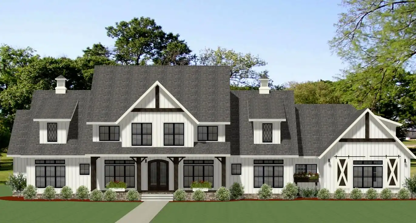 Six bedrooms and five baths are found in this spacious modern farmhouse. A welcoming front porch leads into a spacious foyer with a view into the two-story great room. A cozy fireplace makes for the perfect family gathering spot which also leads out onto a covered rear porch for year-round entertaining. Open to the family room is a generous kitchen offering a large island, walk-in pantry and plenty of cabinets and counter space. A large laundry/mudroom leads into a 3-car garage complete with a shop/storage area, pet grooming area and an optional "man cave" above. A quiet study, guest suite with a full bath and two family bedrooms each with walk-in closets are found on the main level as well as a private master suite. Included in the master is a large 5-fixture bath, oversized walk-in closet and a quiet sitting area with a convenient coffee bar. The second level offers two more family bedrooms, each with a private bath, walk-in closet and quiet desk area. A finished bonus is the perfect playroom while the 2nd bonus room is unfinished for future use.