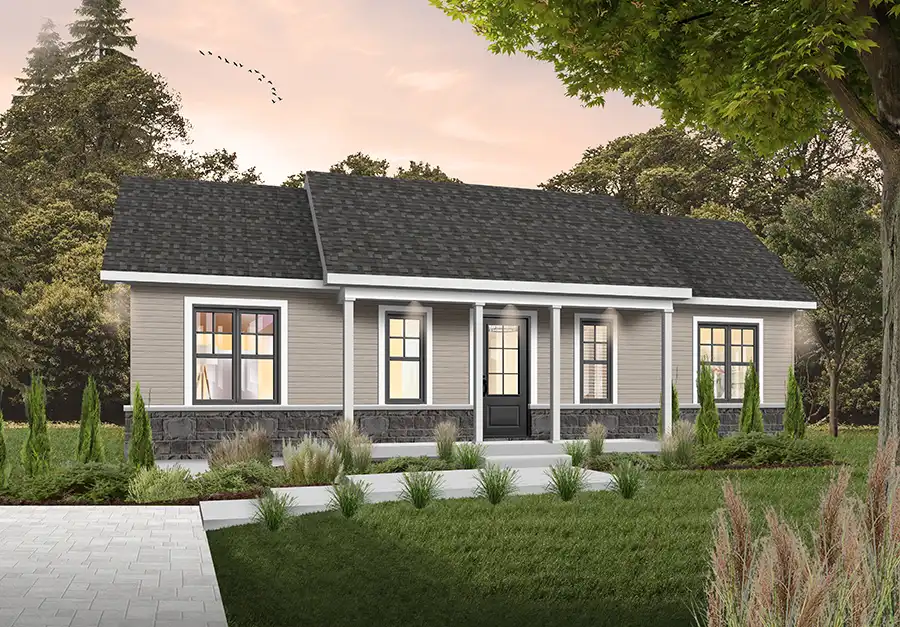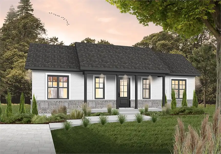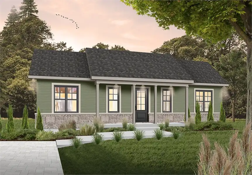 This home features 3 bedrooms, a full bathroom, large open living space and a huge kitchen island wrapped up in 1,053 sqft. An adorable, one story plan that is ideal for the first time home owners or builders looking to build a quality and fashionable home on a budget. The rectangle footprint is a flexible and functional design.