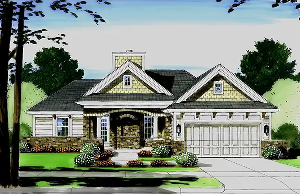 "Close to Nature" and "Rustic" would describe the exterior of this delightful one level home decorated with a stone chimney and covered front porch. The master bedroom set to one side offers a rear yard view, private bath and walk-in closet. Two additional bedrooms set to the opposite side offer a guest suite or secondary bedrooms for younger family members. The open concept great room enjoys a 10' ceiling height while the ceiling drops to 8' through the kitchen and dining. An island with seating defines the space and can provide for a buffet style dining experience if desired. The main floor laundry offers space-saving convenience and multiple closets and pantry provide storage. This home is a great start home, empty nester product or vacation home and includes a basement that can be finished for additional square footage.