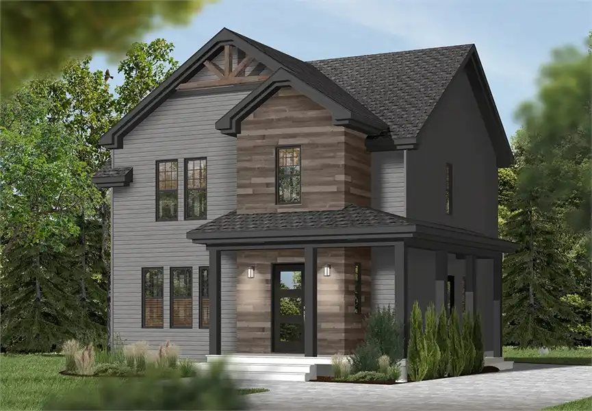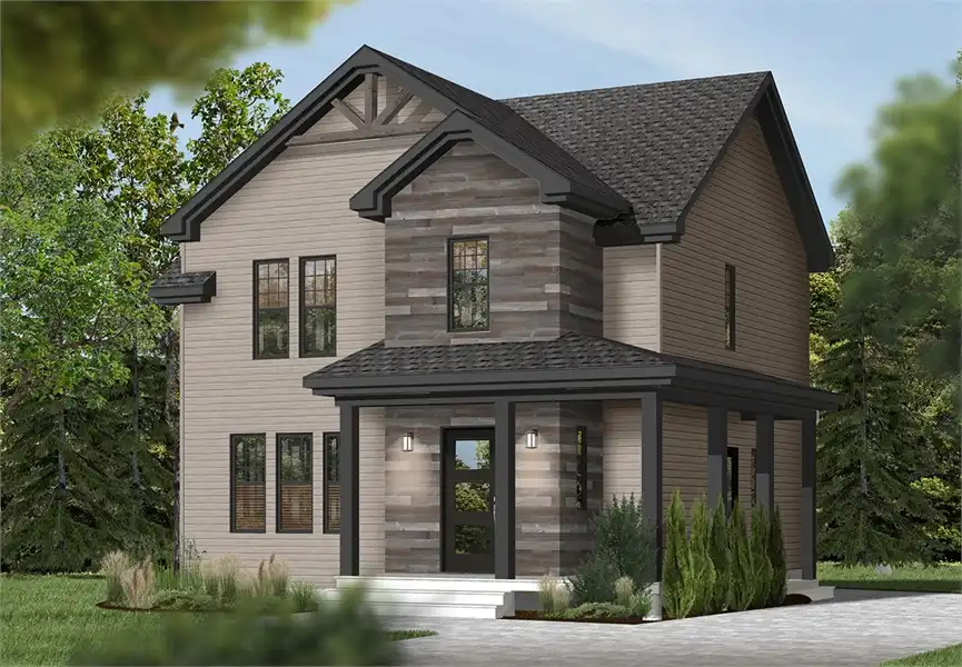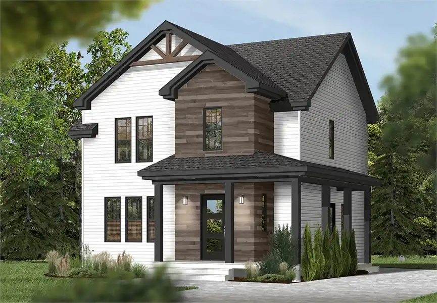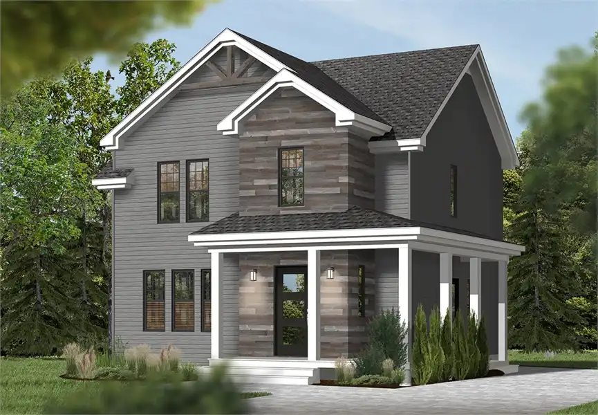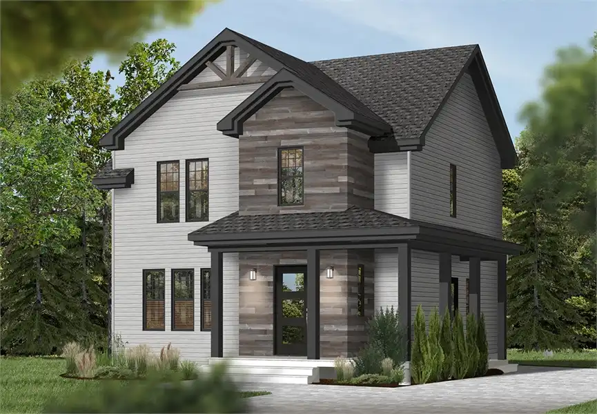Exciting country house plan with contemporary flare. This home features 1,660 sqft with 3 bedrooms and a full bath located upstairs. It has a partial wrap around porch and a foyer area upon entering the home with a storage area located to the left. The living room had decorative columns on two sides. Central island in kitchen open to the main dining area that opens to the back yard. Independent laundry room with cabinets and a sink space. A great plan option if you are looking for the modern farmhouse style on a more narrow lot.