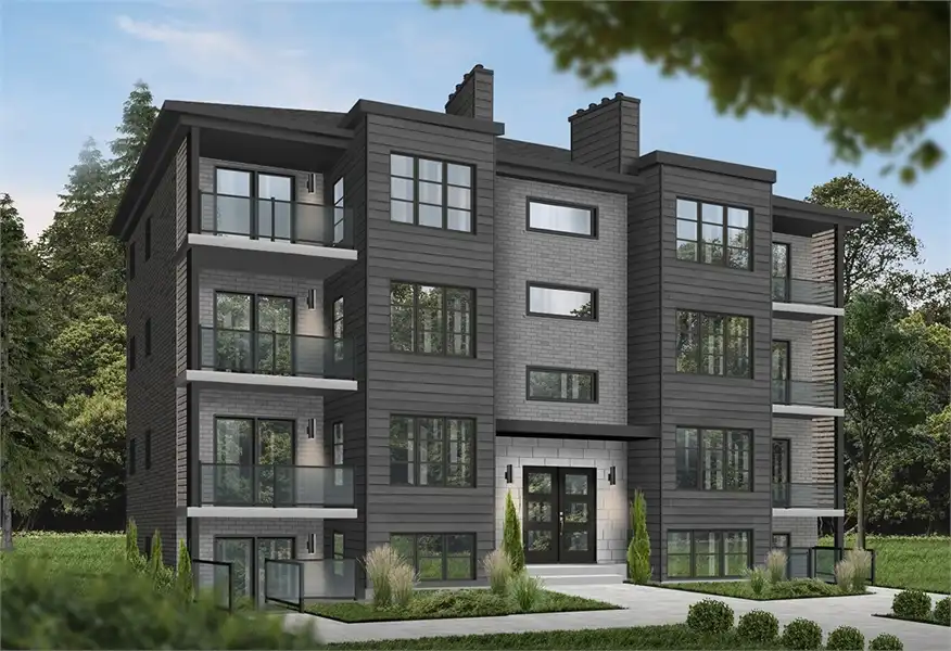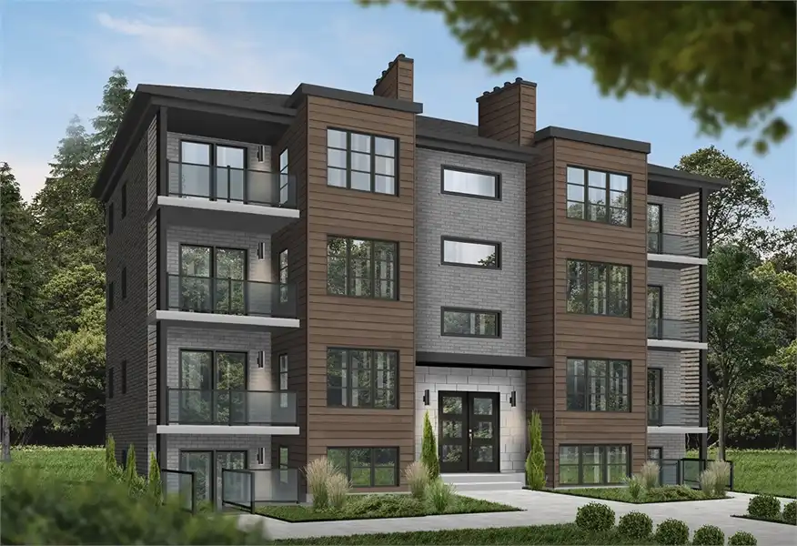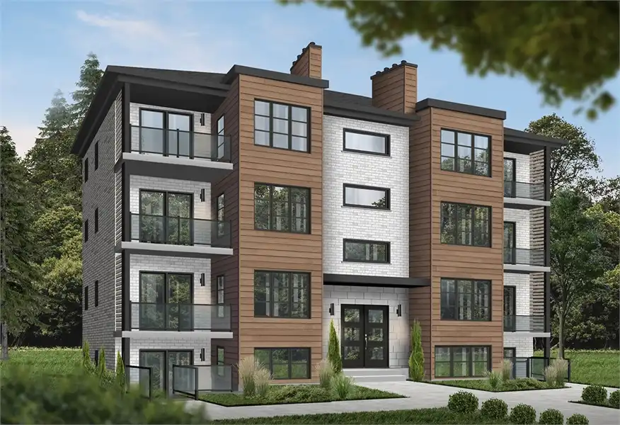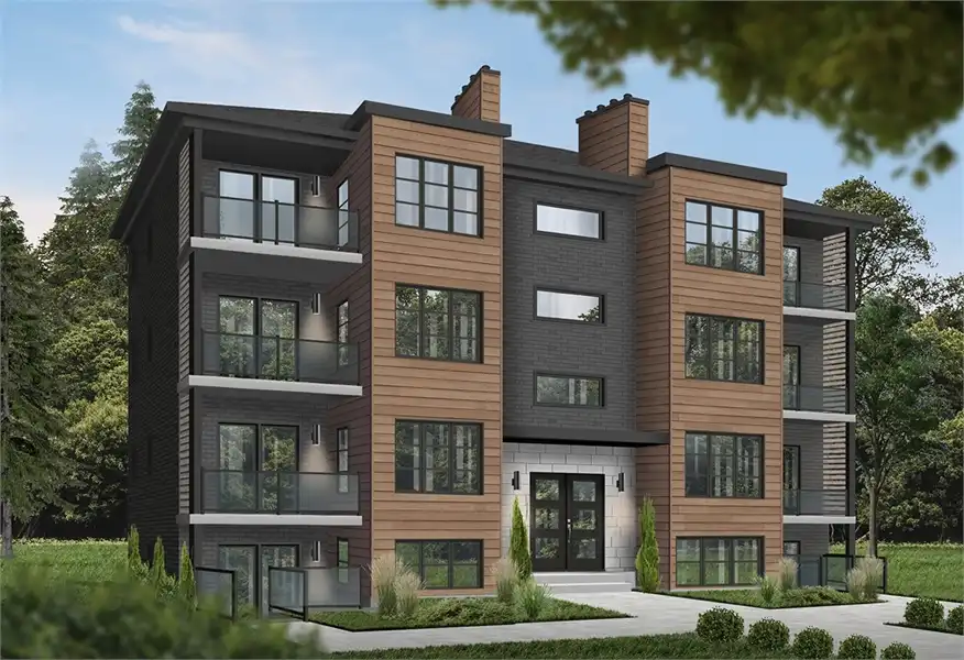 An 8 unit apartment building plan featuring 2 bedrooms and one bath with 953 sqft in each unit for a total sqft of 7,624 sqft. All have a great kitchen with large island, open to the dining and living room. The units contain 2 entry points from two central staircases, laundry room, fireplace and a covered balcony to enjoy views from all angles.