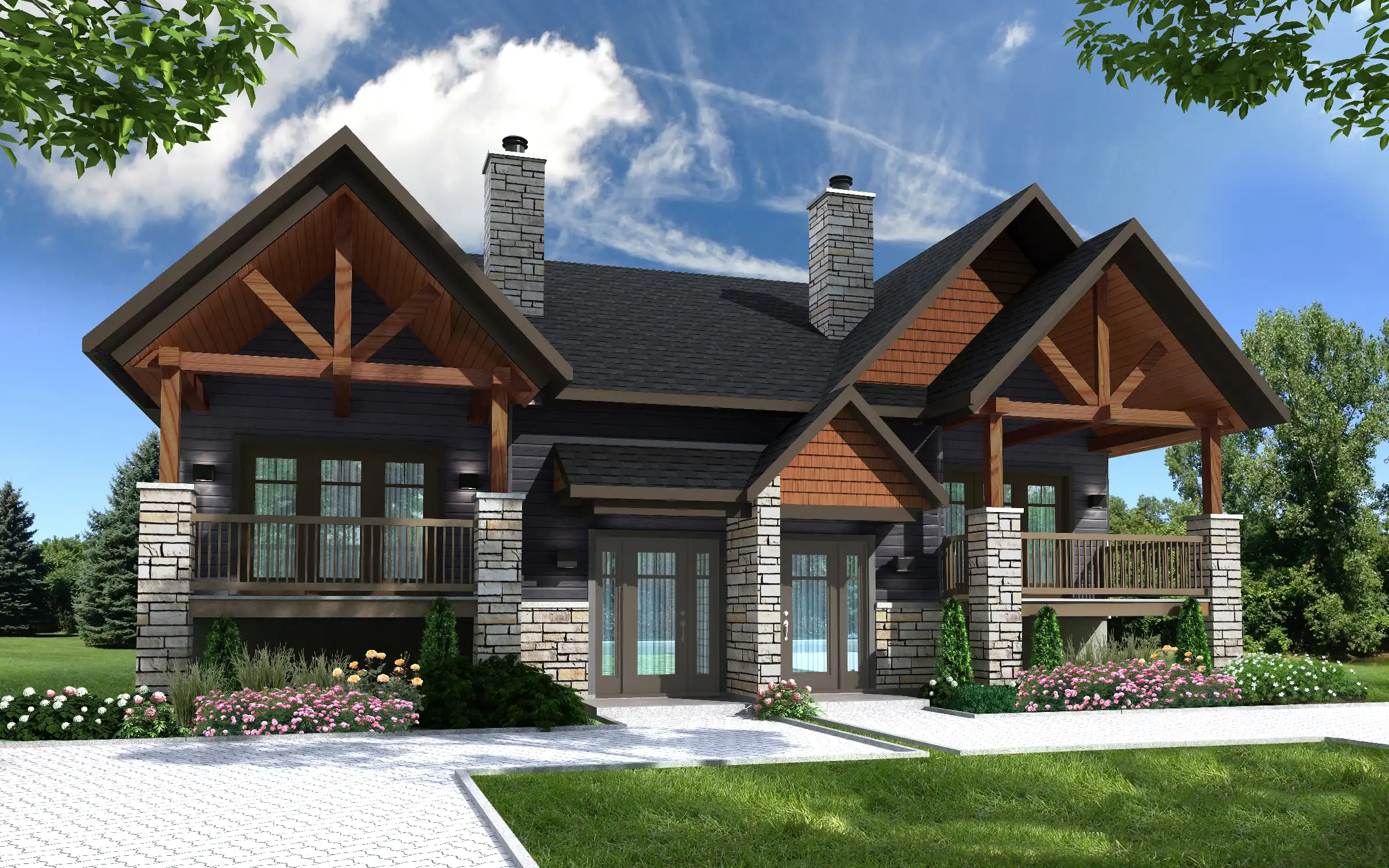 Duplex house plan, Modern Rustic style. Split entry with coat closet and over 12' ceiling. Daylight basement with 3 bedroom, full family bathroom and laundry in closet. Open kitchen / dining / living room concept. Kitchen with pantry, kitchen island and near the half bath. Dining and living room receiving lots of natural light. Living room with access to front covered balcony, great spot for drinks!