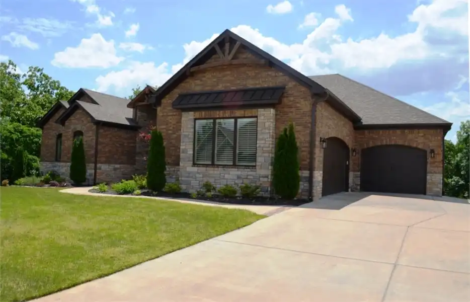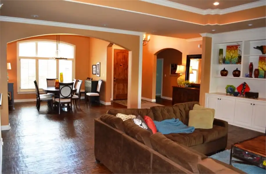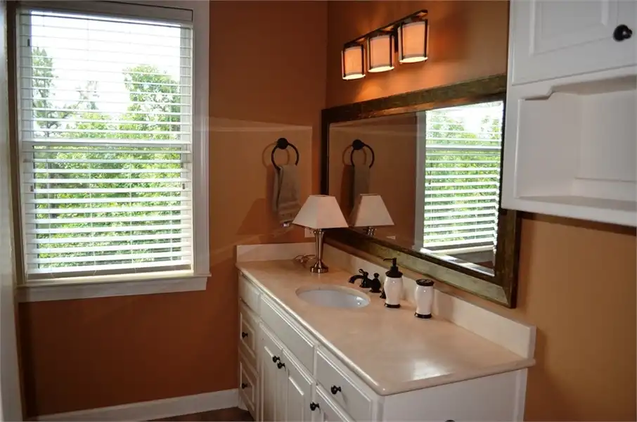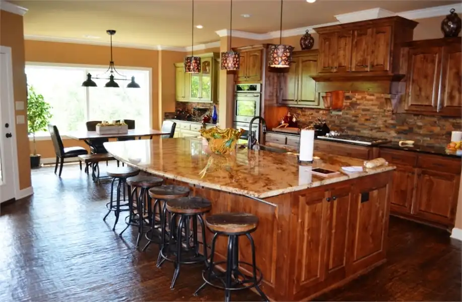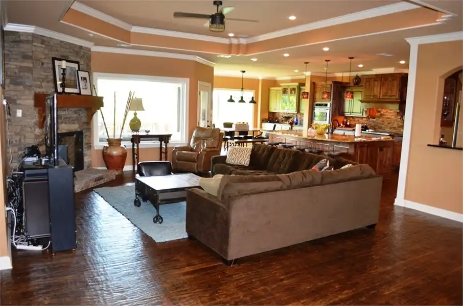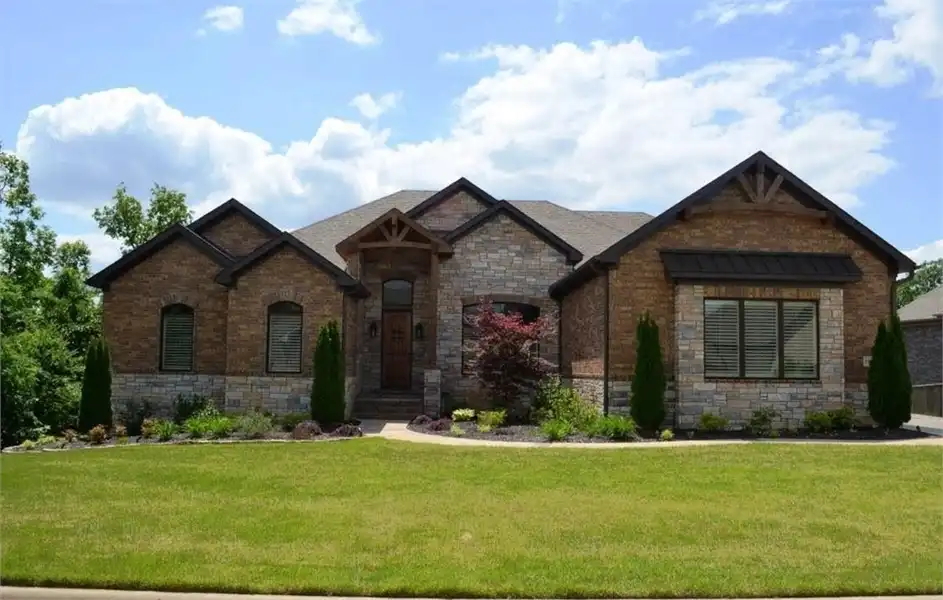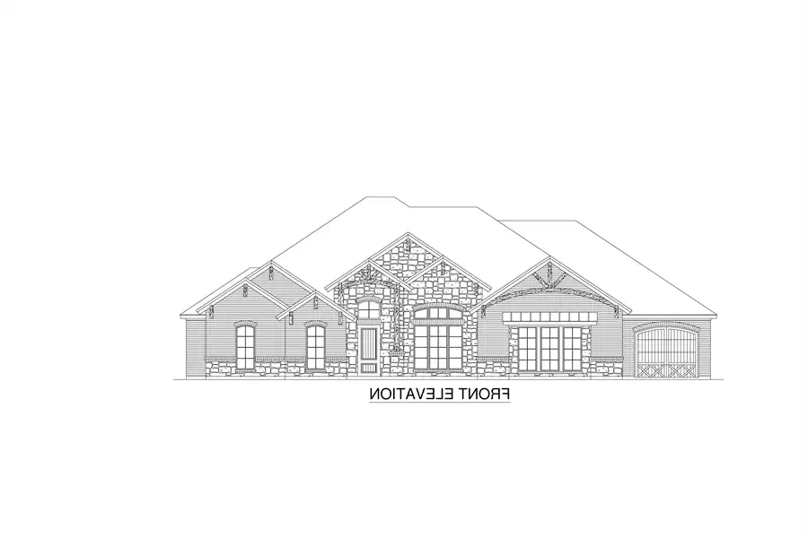 This beautiful country house plan has interesting varied roof lines with a rock and brick exterior with 4 bedrooms and 4 bathrooms. 4,313 total square feet with 3,491 on the main floor and 823 sqft in the walkout basement. The covered entry welcomes with its warming coach lights flanking the front doors, and a square transom above. Down the hall, the front stairs leading to the second story, with a mud room that leads to the two-car garage with side entry, a utility room, and front entry boat garage. Adjacent to the dining room is the open family room, kitchen and breakfast area. A rear family bedroom with large walk-in closet and full bath are adjacent to the boat garage, powder room and kitchen pantry. A second family bedroom at the front corner of the home offers a large walk-in closet and full bathroom. A study with bayed sitting area, storage closet, and built-ins is between the front family bedroom and the master suite, making for a split bedroom plan. The master suite boasts a luxurious master bath with his and hers vanities, separate shower and tub, and a large wardrobe with built-ins. This is a wonderful luxury family home plan.