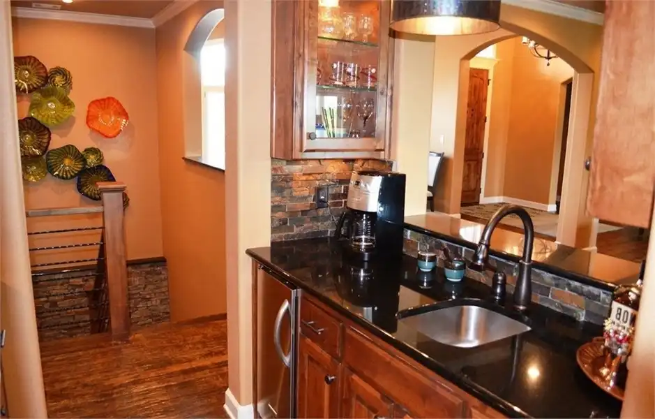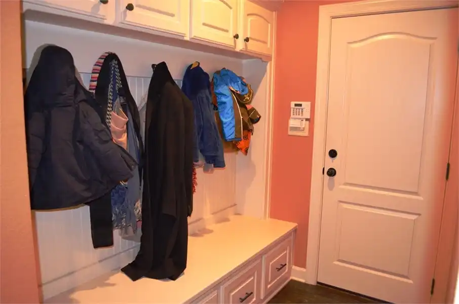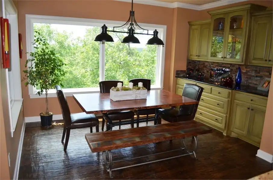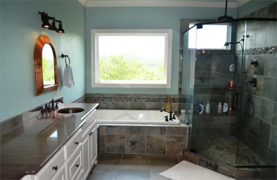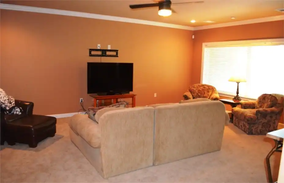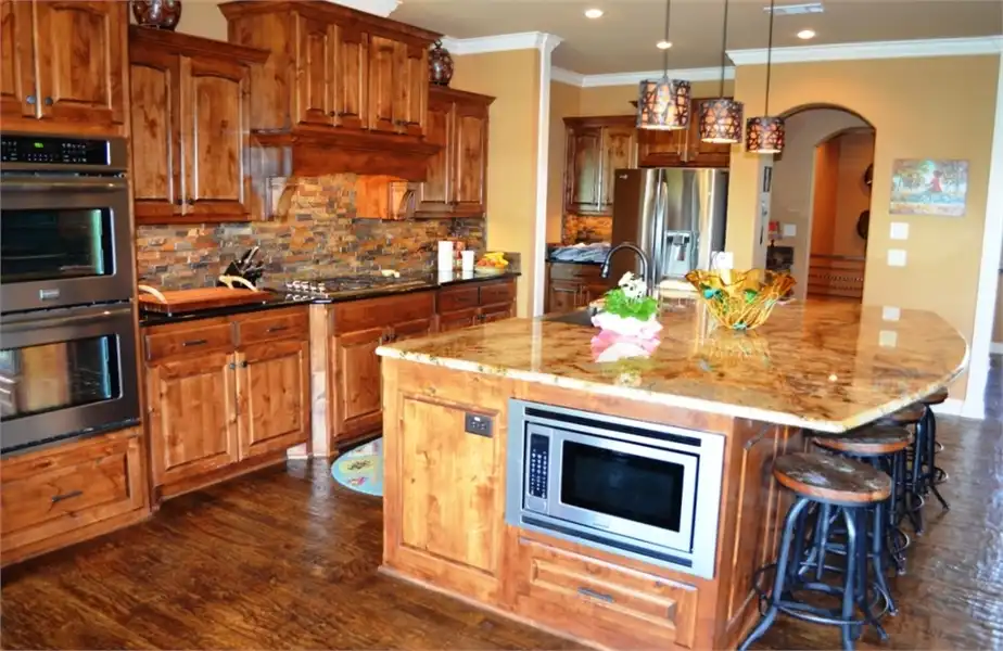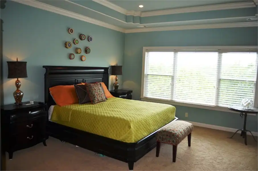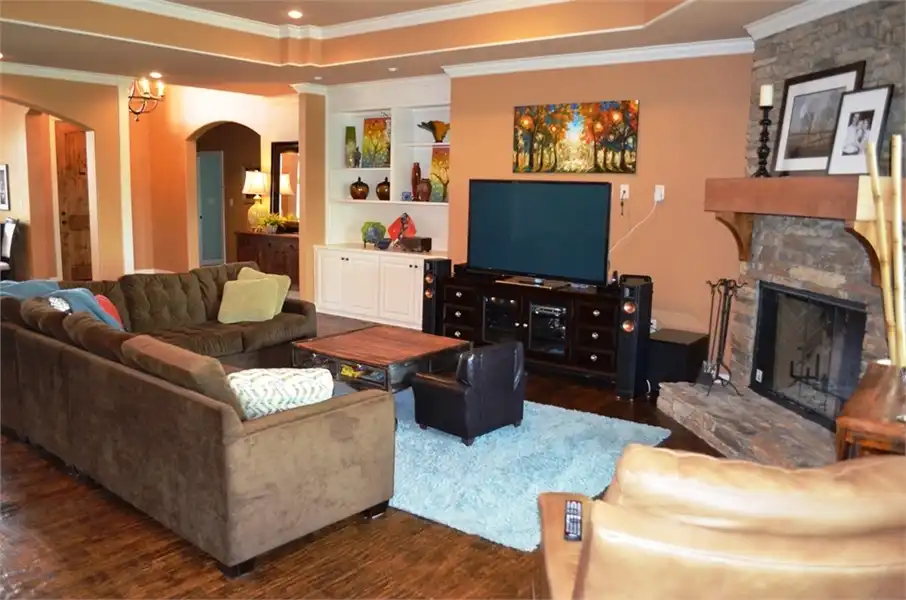 This beautiful country house plan has interesting varied roof lines with a rock and brick exterior with 4 bedrooms and 4 bathrooms. 4,313 total square feet with 3,491 on the main floor and 823 sqft in the walkout basement. The covered entry welcomes with its warming coach lights flanking the front doors, and a square transom above. Down the hall, the front stairs leading to the second story, with a mud room that leads to the two-car garage with side entry, a utility room, and front entry boat garage. Adjacent to the dining room is the open family room, kitchen and breakfast area. A rear family bedroom with large walk-in closet and full bath are adjacent to the boat garage, powder room and kitchen pantry. A second family bedroom at the front corner of the home offers a large walk-in closet and full bathroom. A study with bayed sitting area, storage closet, and built-ins is between the front family bedroom and the master suite, making for a split bedroom plan. The master suite boasts a luxurious master bath with his and hers vanities, separate shower and tub, and a large wardrobe with built-ins. This is a wonderful luxury family home plan.