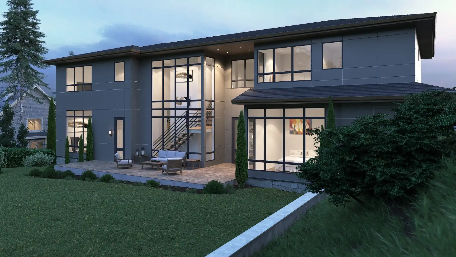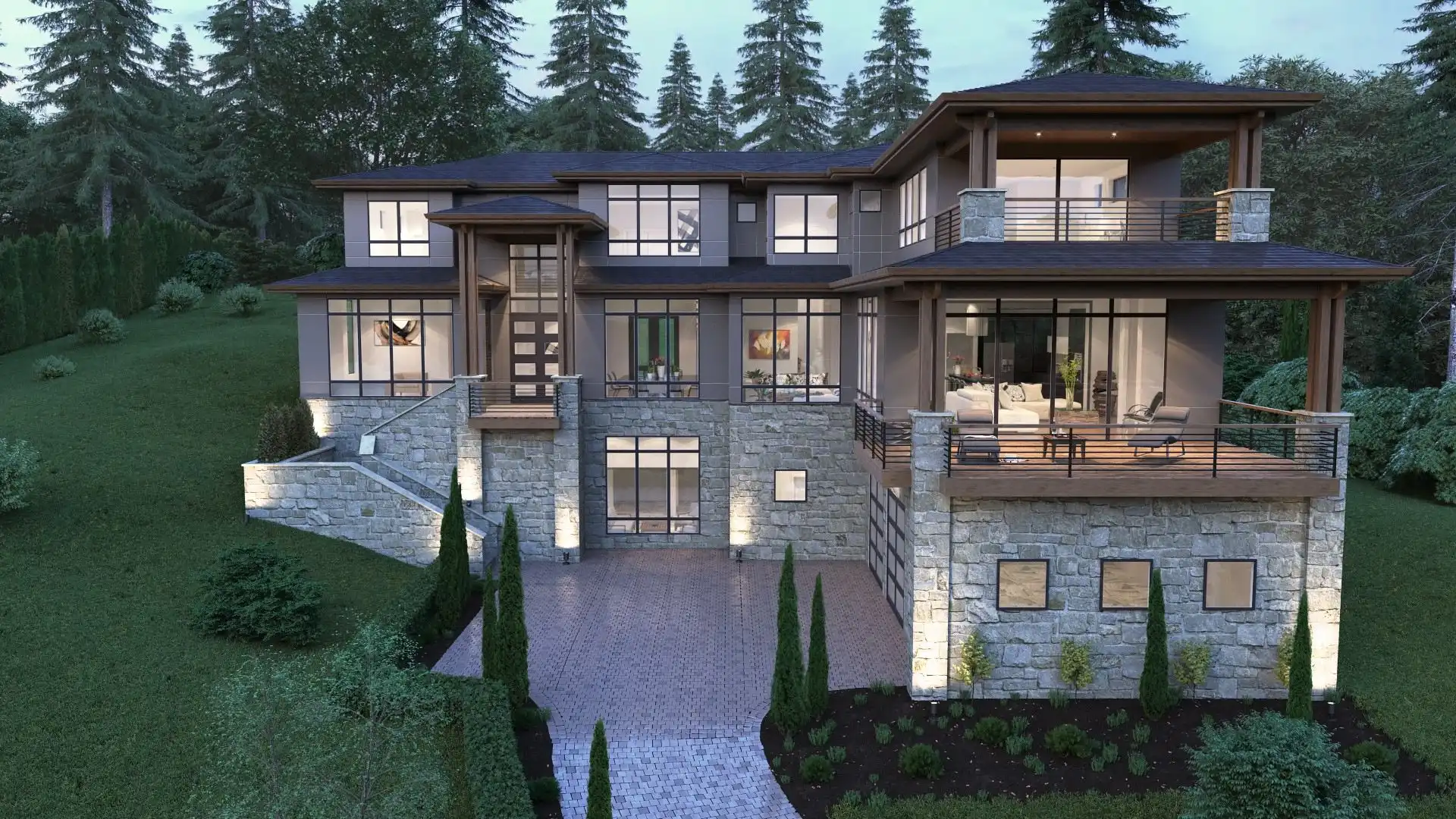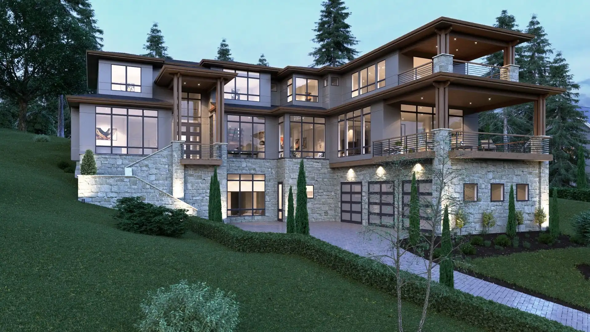 The epitome of a modern marvel, this 3-story contemporary plan is a fabulous option for families of all sizes. Beginning with its 6,901 square foot interior, offering 5 bedrooms and 5.5 bathrooms, this plan is packed full of surprises. As you first drive up, take note of the stunningly large windows and beautiful open-air decks, adorning every level of the home. You can access inside both via the attached 3-car garage on the ground level, and by the front staircase, leading to the covered entryway. The ground level also has a home theater and kitchenette! As you move up to the main floor, choose the stairs or relax in your in-home elevator, the choice is yours. The main level houses an open concept, joining spaces such as the family room and dining room, with the parlor and stunning island kitchen. This floor also comes with a fully equipped guest suite which includes a private bath and walk-in closet. The third and final floor finds all of the other bedrooms, each with their own en-suite and walk-in closets as well. The gem of this floor is found in the master suite, providing you with a relaxin spa bath, spacious walk-in closet, and even a private balcony, overlooking the entire home below.